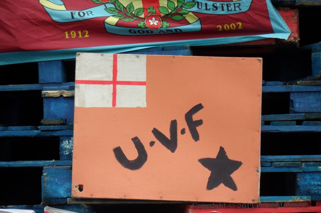 This is the internment (or “assumption”) bonfire in the Bogside with what appear to be hand-painted boards depicting a PSNI land-rover and the flags of the UVF, Scotland, Israel, and LVF. It is not known if these were stolen or painted exclusively for the purpose of burning.