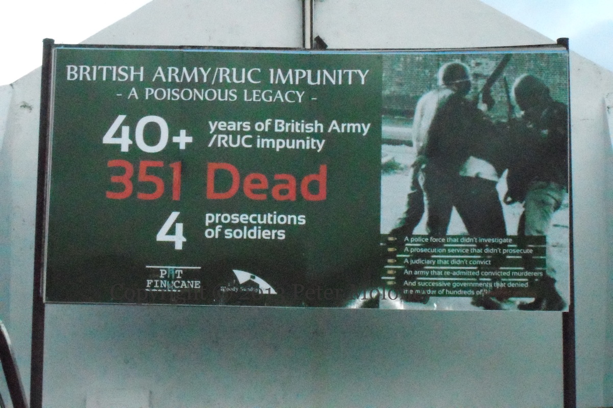 “British Army/RUC impunity – a poisonous legacy. 40+ years of British Army/RUC impunity, 351 dead, 4 prosecutions of soldiers. A police force that didn’t investigate, a prosecution service that didn’t prosecute, a judiciary that didn’t convict, an army that re-admitted convicted murderers, and successive governments that denied the murder of hundreds of [?interned?] civilians.”