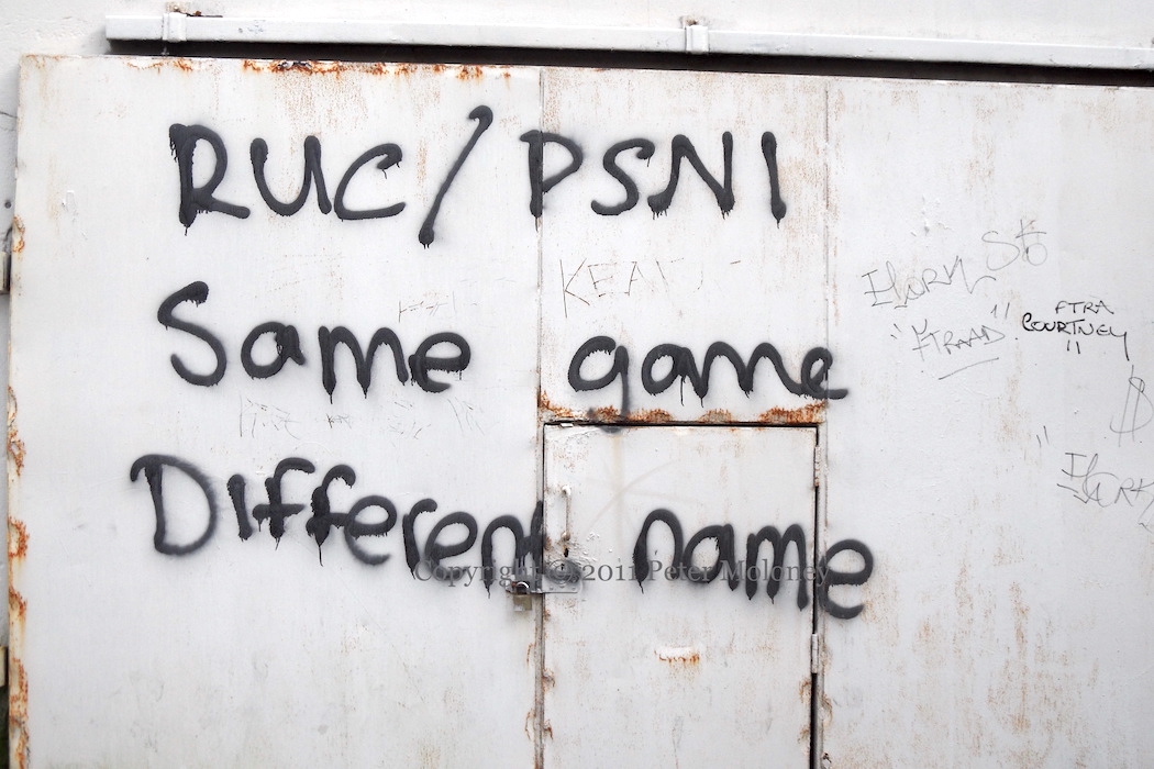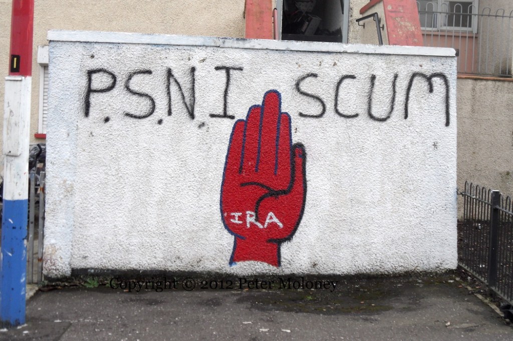 Anti-Agreement republican graffiti and heavily-vandalised board listing the faults of the PSNI. “End British policing in Ireland – intimidation, sectarianism, 28 day detention, corruption, child assaults, evidence tampering. http://www.32csm.info [now 32csm.org]”
