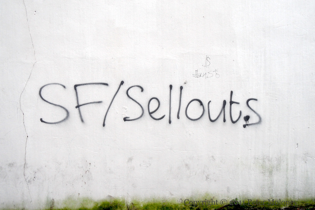 “No PSNI”, “Slash Stormont, not services” – éırígí stencils on the site of the former RUC barracks at the Falls Rd/Glen Rd junction.