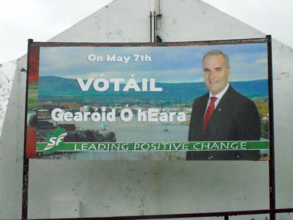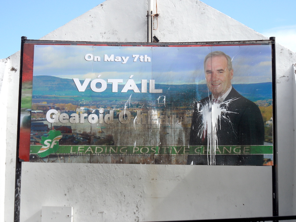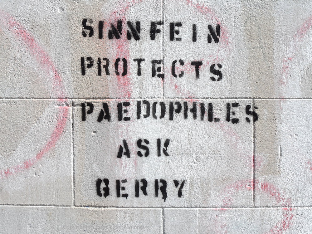 “Sınn Féın protects paedophiles – ask Gerry”. The reference is perhaps to Brendan Curran’s allegations about the party covering up abuse by a Catholic priest (Indo) and the “ask Gerry” part a reference to Liam Adams’s 2013 conviction and the investigation into whether his brother, Gerry Adams, had withheld information about it (Guardian).