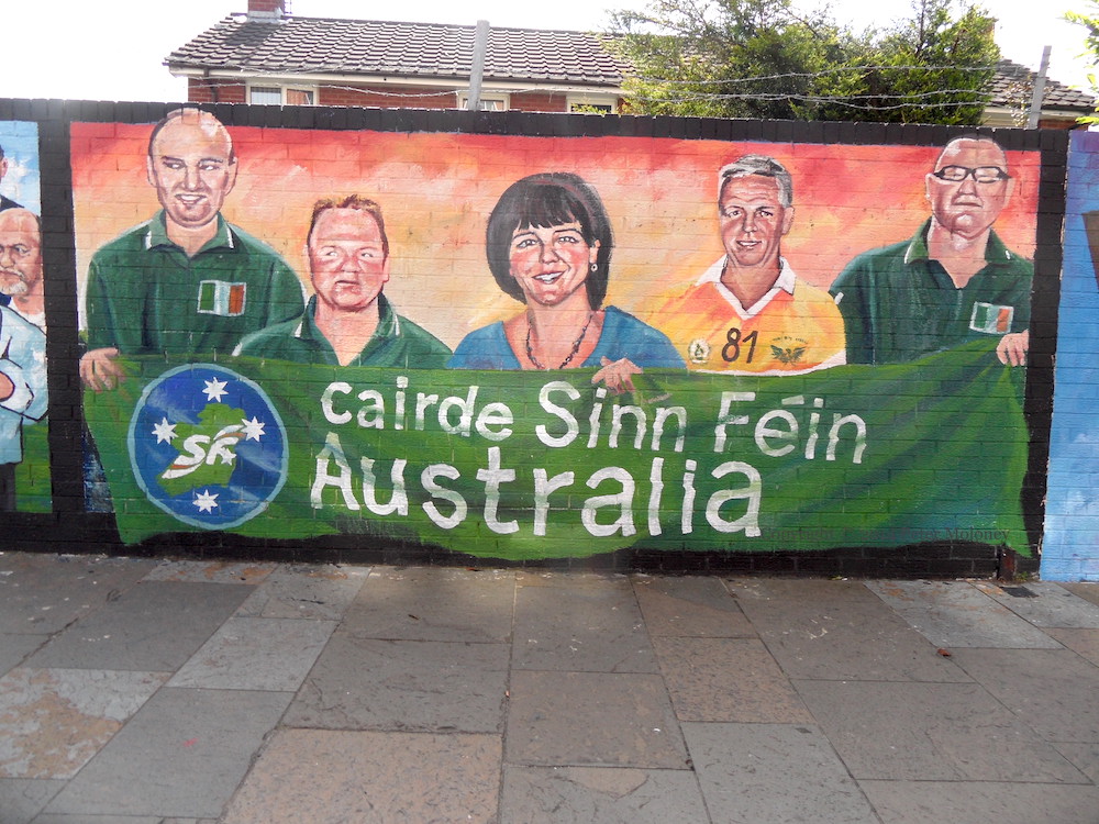 This Caırde Sınn Féın (Fb) mural joins others in Conway Street sponsored by Australian groups. From left to right, the four are: Australian Aid For Ireland & Saoırse Melbourne | this Caırde Sınn Féın mural | AMWU mural | ETU (the Electrical Trades Union).