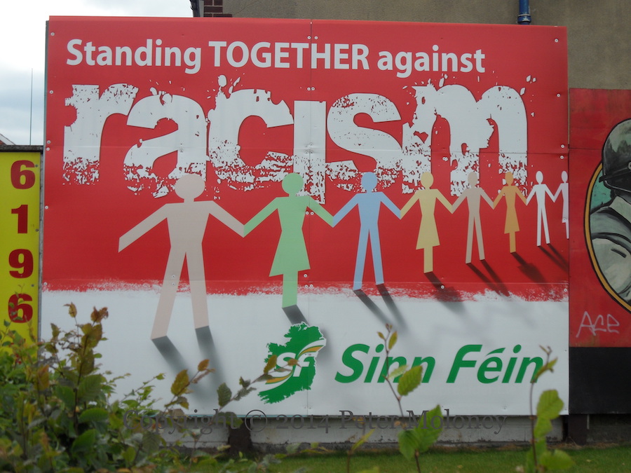 Here are two Sınn Féın boards on contemporary social issues, at the old Andersonstown RUC barracks. First is “Stand together against racism”; second is support for an Irish Language Act “Sınn Féın ag tacú le Lá Dearg Na Gaeılge, 12 Aıbreán – ag teacht le chéıle ag An Chultúrlann, Bóthar na bhFál, Béal Feırste, 2.00 in.”