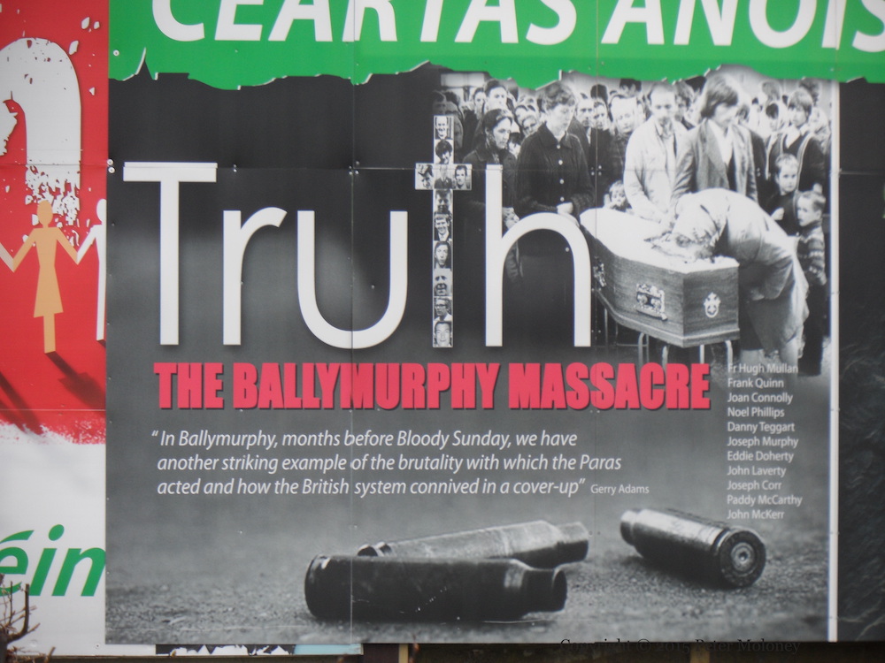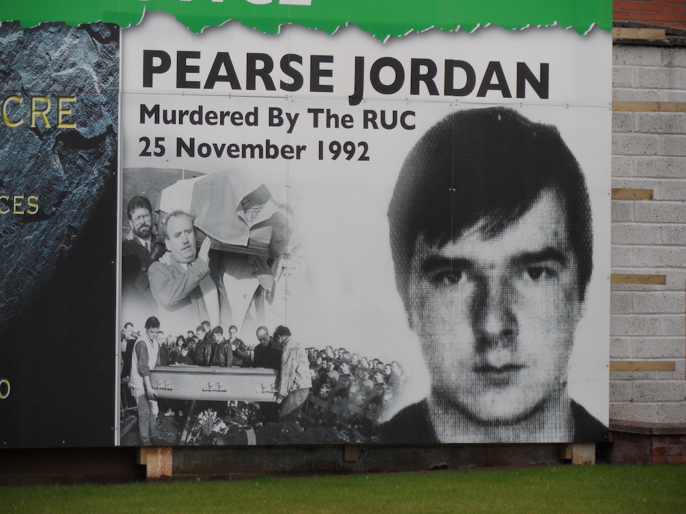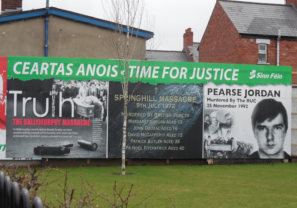 Three different campaigns for inquiries into deaths at the hands of British paratroopers are brought together into a single board on the site of the former Andersonstown RUC station (Visual History): the Ballymurphy Massacre of August, 1971, in which 11 were killed; the Springhill Massacre of July 1972, in which 5 were killed, and the killing of IRA volunteer Pearse Jordan, who, like the others, lived in the greater Ballymurphy area.