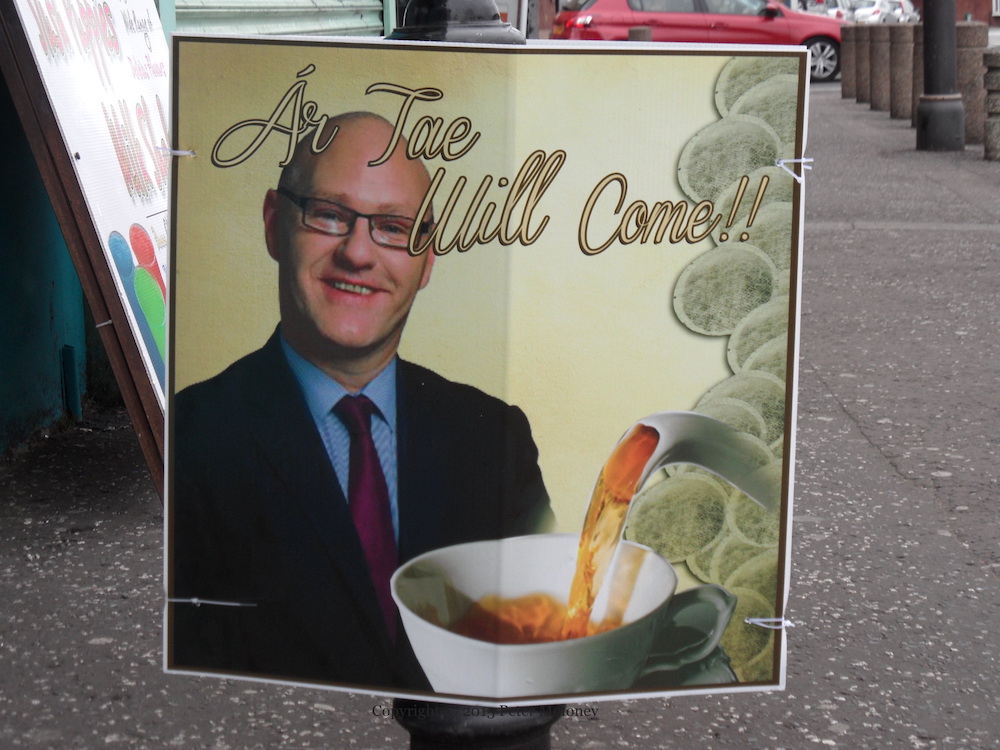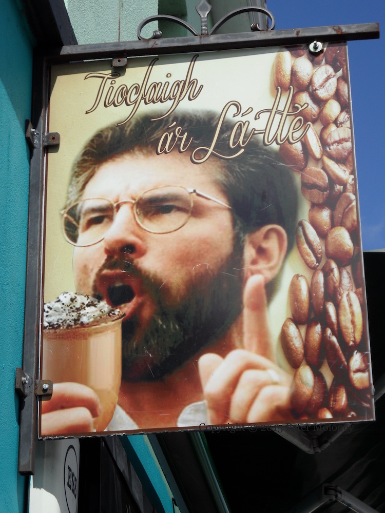 Sınn Féın representatives Paul Maskey (above), Gerry Adams, Alex Maskey, and Martin McGuinness are photoshopped into these coffee-themed, Irish-language puns outside the ‘Falls Rolls’ bakery: Ár tae will come, Tıocfaıgh [sic] ár látte, Al cappuchino, and Mocha-ra.