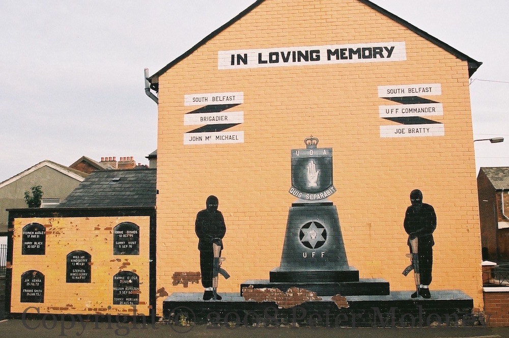 The same thirteen names also appear on the “roll of honour” plaque in the garden. The South Belfast UDA/UFF commander John McMichael was killed by an IRA car bomb in 1987. In addition to organising a team of assassins in the 70s and 80s, he founded a Political Research Group and wrote two documents proposing an independent Northern Ireland. Joe Bratty was killed, along with “Raymie” Elder, by the IRA in 1994 (WP).