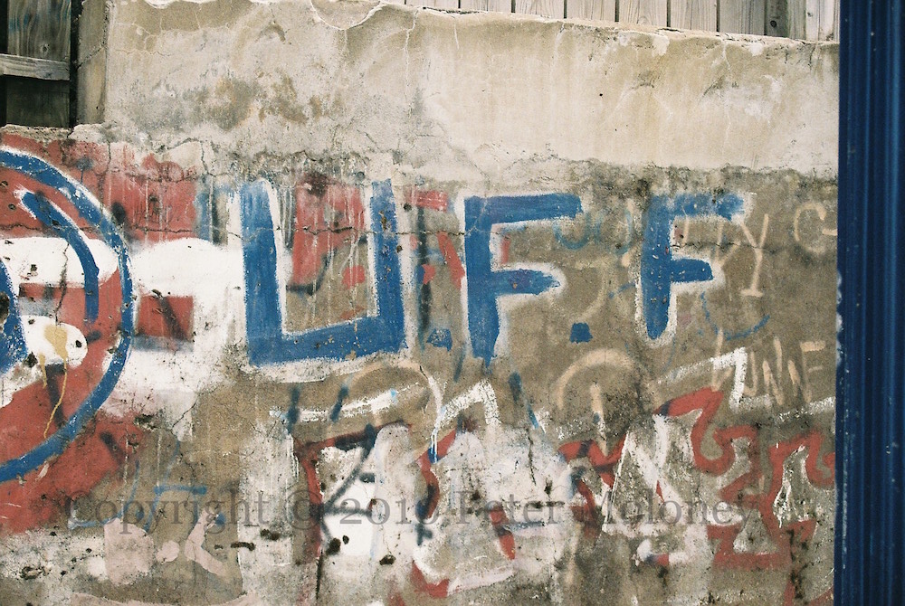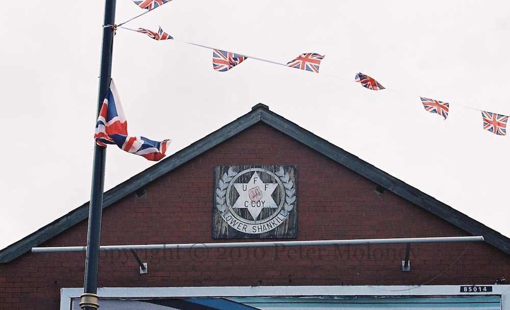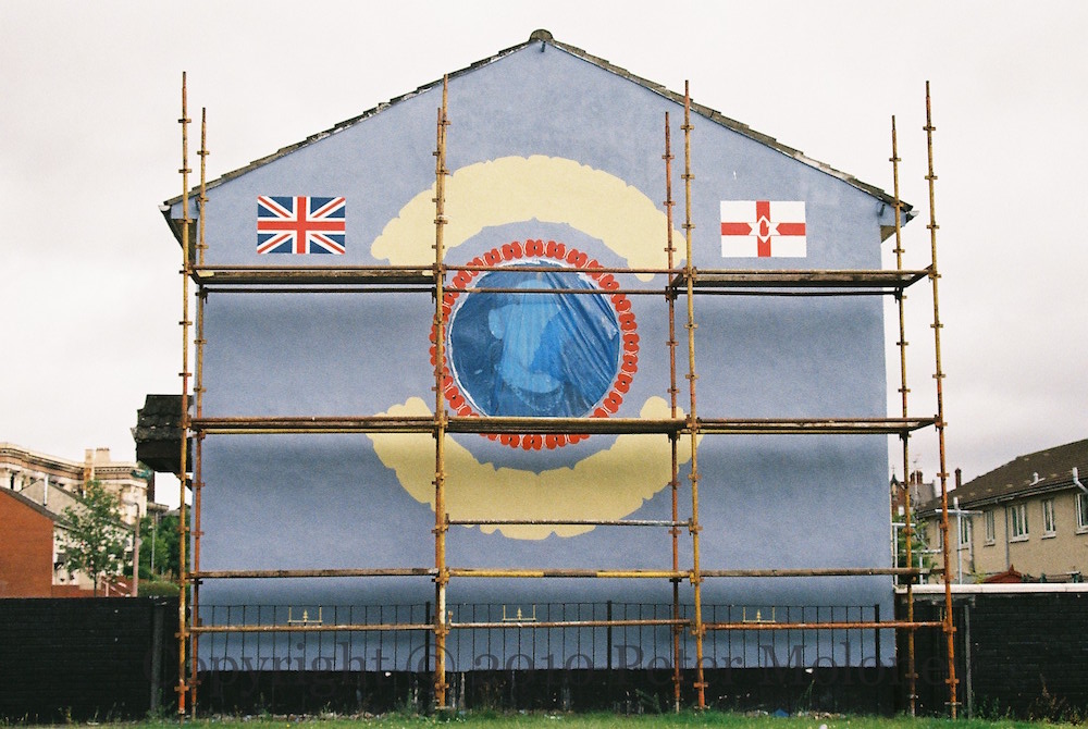 The mural to UDA assassin Stevie ‘Top Gun’ McKeag is again (or, still?) in progress. Compared to the 2009 version (itself incomplete) the poppies around the portrait have lost their leaves (perhaps due to a new background colour) and his dates of birth and death have been turned into a Union Flag and Ulster Banner. See also 2008 and 2007.