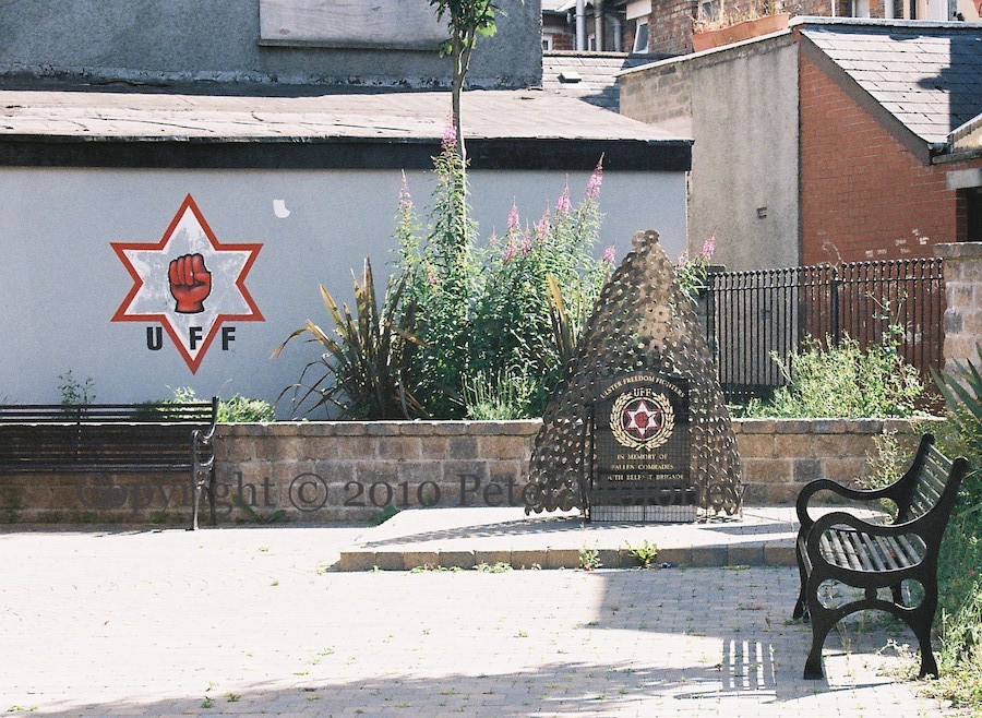 This UDA memorial garden is in Lemberg Street, at the top of (south Belfast) Roden Streeet. The plaque to John McMichael and eleven others would later be moved to Sandy Row. The stone on the right reads “In memory of fallen comrades south Belfast brigade”.