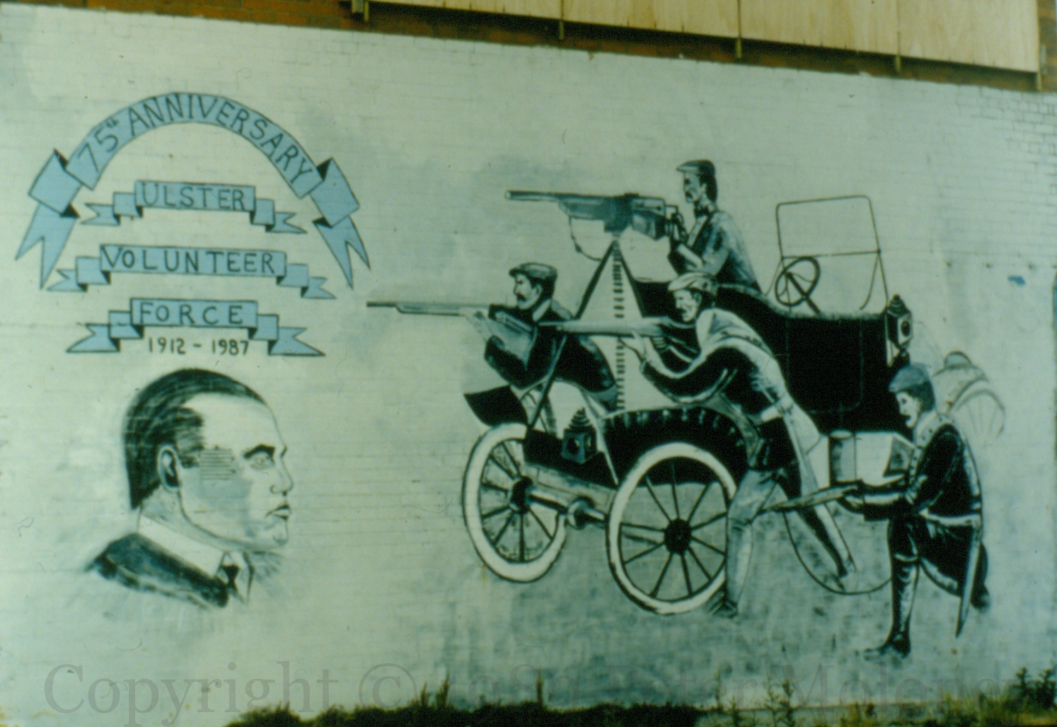 75th anniversary (1912-1987) mural of the Ulster Volunteers on the Shankill Road, Belfast. For the photgraph on which the mural is based, see the 1988 version.