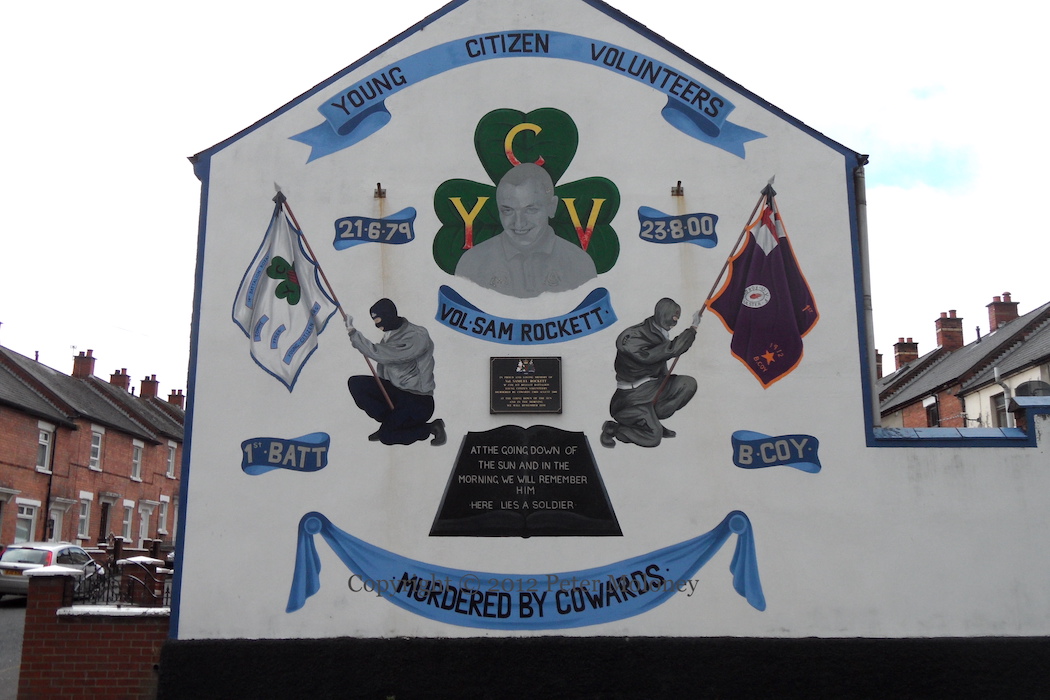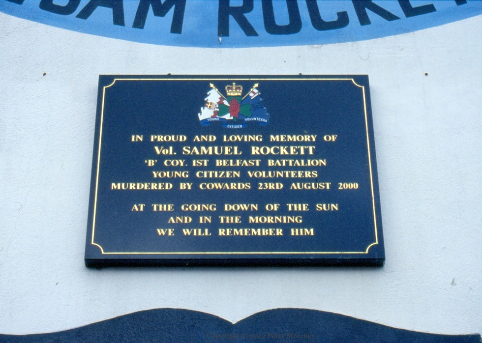 “In memory of Vol. Denver Smith, murdered by cowards 1st January 2000. Here lies a soldier. He gave his life whilst serving his community. Lest we forget.” Smith was killed by a gang of six men with machetes and pikes; the incident was perhaps drugs-related (Guardian | BBC-NI. For the wider picture An Phoblacht | Irish Times).