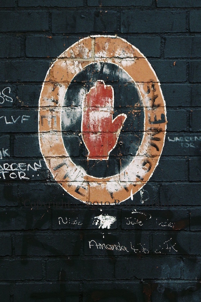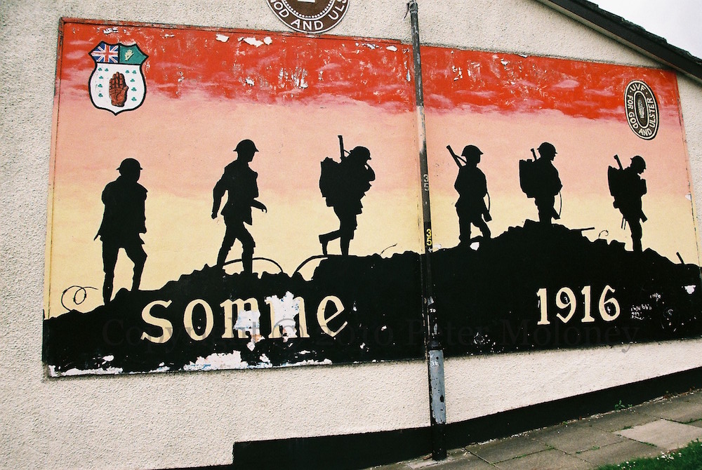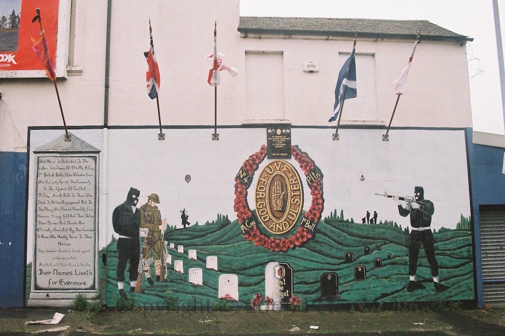 This “C company, 1st Belfast battalion, Ulster Volunteer Force roll of honour” in Carnan Street, Belfast, uses WWI (USSF insignia, an image of soldiers on the battlefield, poppies, and a verse from In Flanders Fields) to commemorate 25 volunteers from the middle Shankill area. (For the first five, see also the plaque across the street.) The “Four Step” was a pub bombed in 1971 (see X02393).