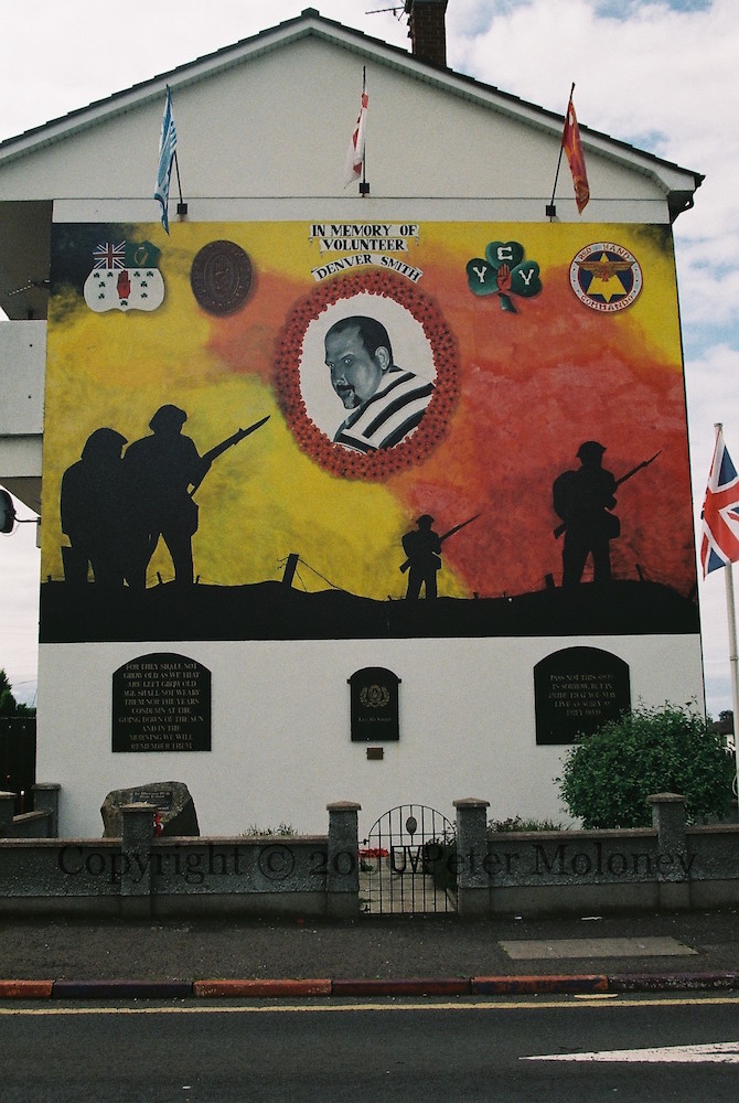 Volunteer Andrew Cairns was killed by the UDA at the Boyne Square bonfire in 2000. Major Sinclair Johnston was shot dead by the British Army during a riot in St John’s Place in 1972. The mural commemorating them is in Wellington Green, Larne.