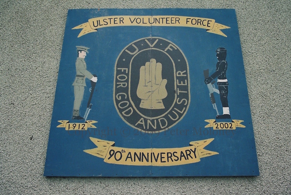 The Sons Of Ulster (Fb)/UVF mural in Conway Walk is repainted (compare with 2006). The main wall adds some new names on the far left (Metcalfe and Balmer); the side wall is converted to an image of the 36th (Ulster) Division going over the top.