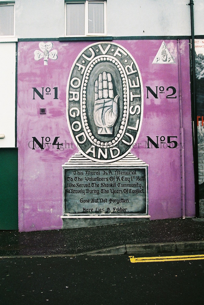 2009 image of a fading UVF mural in Canmore Street (compare 2005 and 2008). “This mural is a memorial to the volunteers of ‘A’ Coy 1st Batt who served the Shankill community so bravely during the years of conflict. Gone but not forgotten. Here lies a soldier.”
