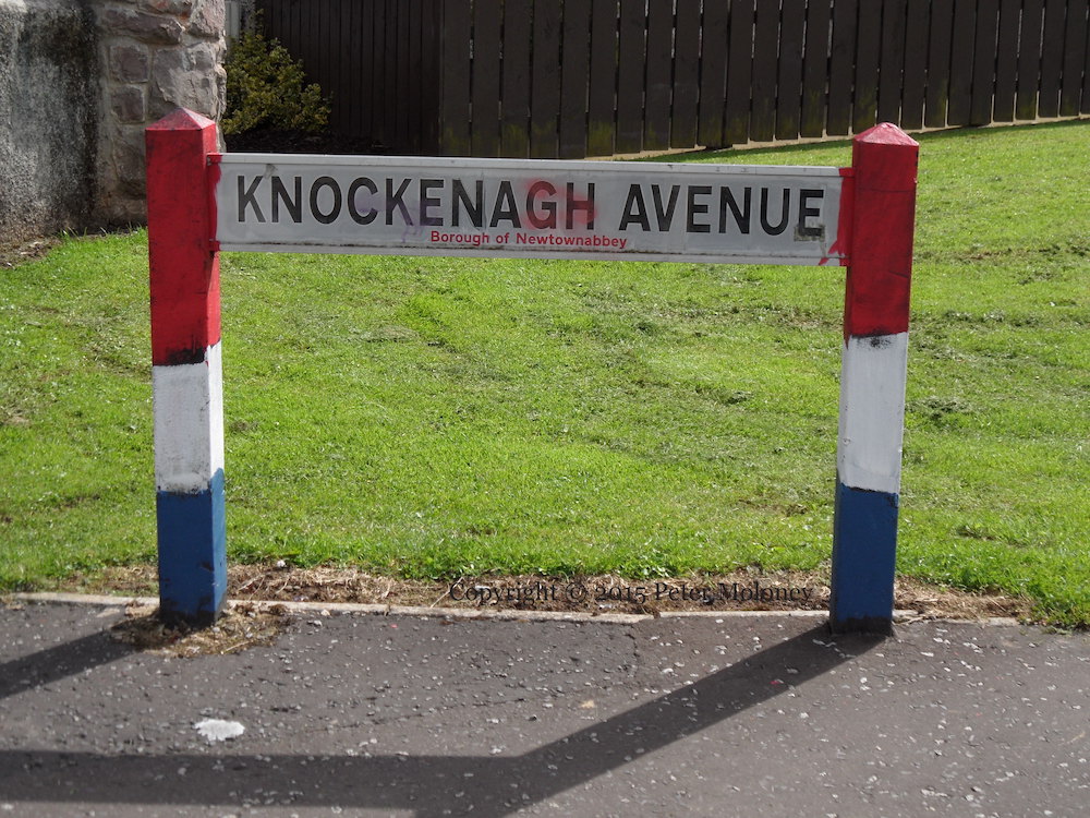 Nearby red-white-and-blue poles on Knockenagh Ave, Newtownabbey, are also shown.