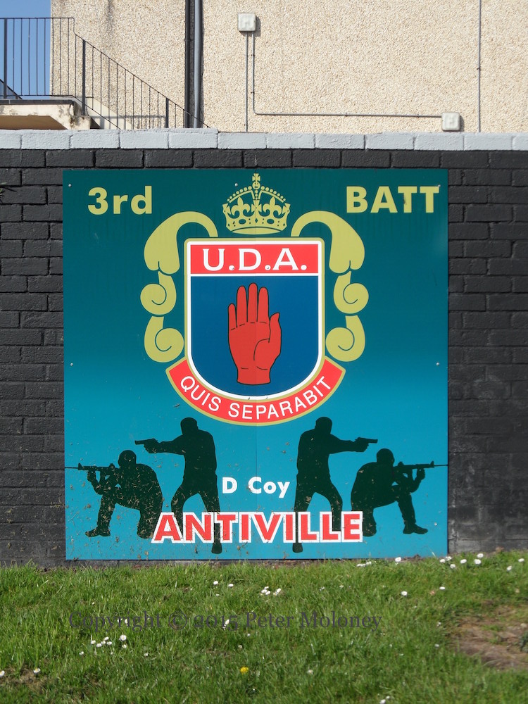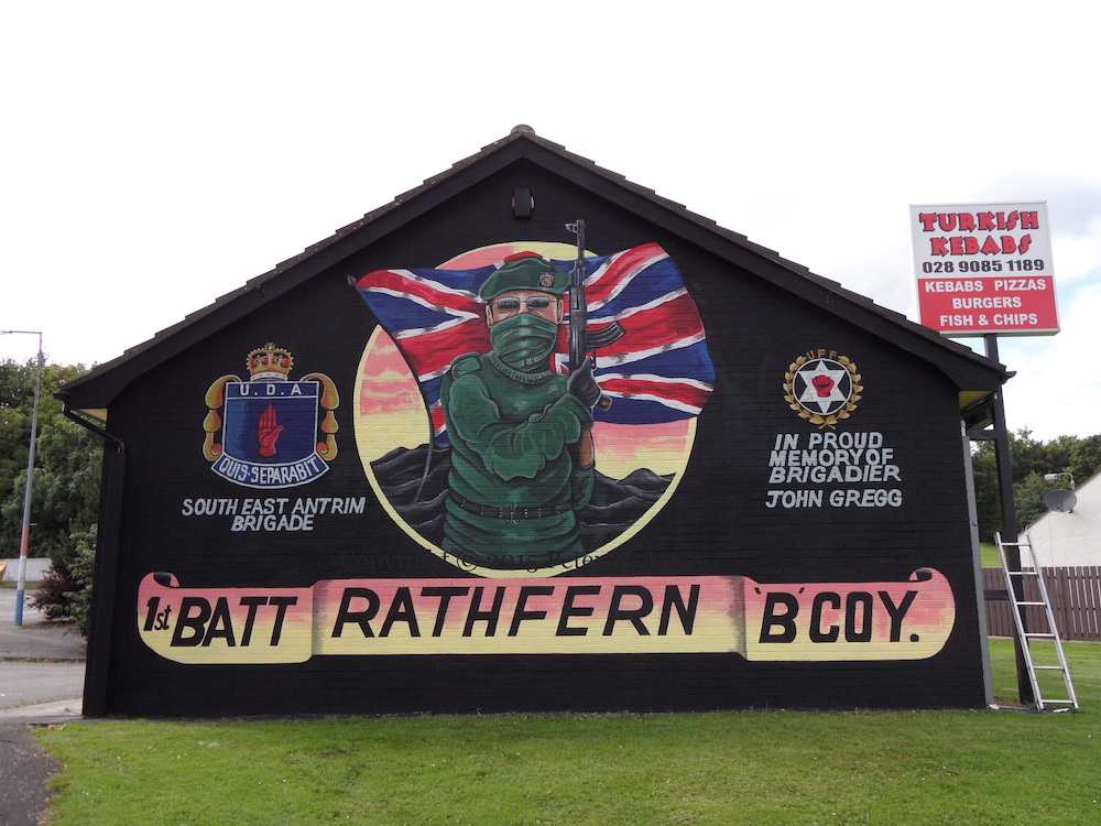 This is a new UDA mural in memory of John Gregg, “The Reaper”, who waged a campaign of terror against Catholics in south-east Antrim and was reputedly associated with British neo-Nazi groups. Gregg was gunned down in 2003, while returning from a Rangers match, as part of the power struggle with Johnny Adair.