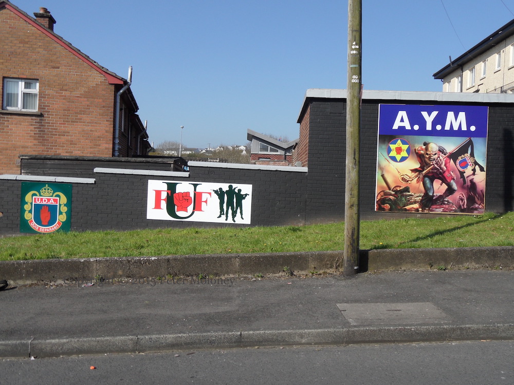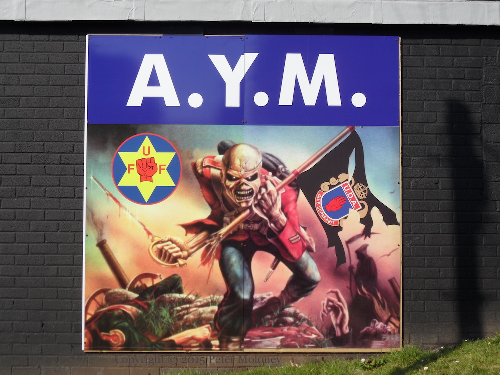 This is a very aggressive set of boards, in Hampton Crescent behind the Antiville (Larne) community centre: two of them show silhouetted UDA (3rd battalion, D company) gunmen in active poses, and another deploys the fearsome figure of Eddie The Head. Rather than the Union flag that he carries in other murals and on the original Iron Maiden album cover (see Eddie’s Visual History page), in this version “The Trooper” carries a UDA flag (with the UFF symbol also shown). “AYM” is presumably “Antiville Young Militants”.