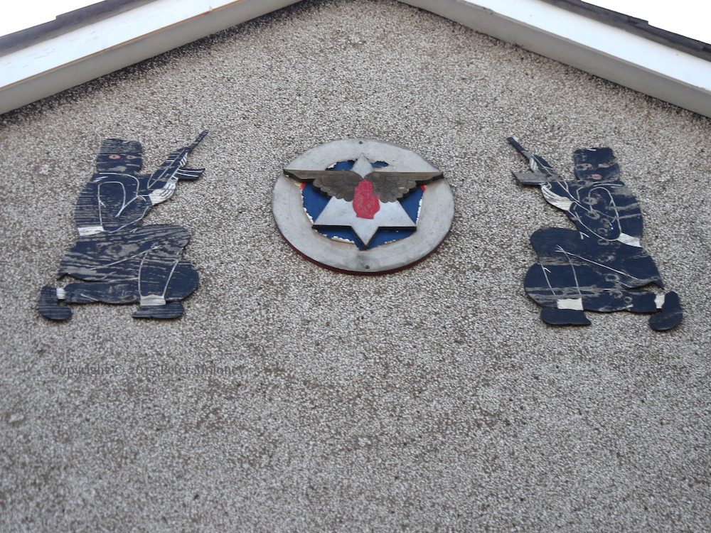 This is a vintage cut-out in the Sunnylands estate (visible in 2008 Google Street View). The central board – a RHC emblem – had a plastic or paper layer between the star/wings and the circular back-board with red-white-and-blue colours and the words “Red Hand Commando” in a circle. The hooded gunmen on either side each appear to be a single, painted, carving.