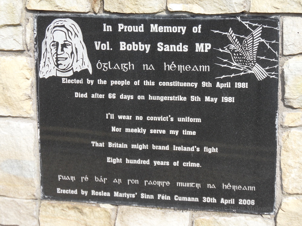 “In proud memory of Vol. Bobby Sands MP Óglaıgh Na hÉıreann. Elected by the people of this constituency 9th April 1981. Died after 66 days on hungerstrike 5th May 1981. ‘I’ll wear no convict’s uniform/Nor meekly serve my time/That Britain might brand Ireland’s fight/Eight hundred years of crime’. Fuaır sé bás ar son saoırse muıntır na hÉıreann.”