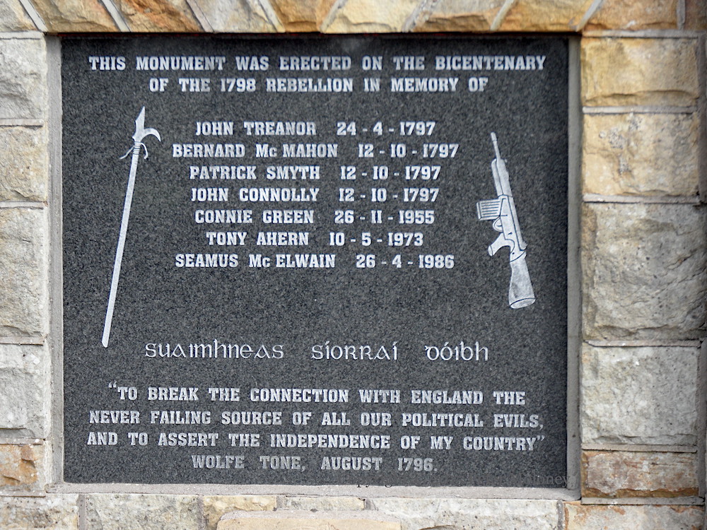 “This monument was erected on the bicentenary of the 1798 rebellion in memory of John Treanor 24-4-1797, Bernard McMahon 12-10-1797, Patrick Smyth 12-19-1797, John Connolly 12-10-1797, Connie Green 26-11-1955, Tony Ahern 10-5-1973, Seamus McElwain 26-4-1986. Suaımhneas síorraí dóıbh. [eternal rest [be] upon them] ‘To break the connection with England the never failing source of all our political evils, and to assert the independence of my country’ – Wolfe Tone, August 1796 [‘An Argument on Behalf of the Catholics of Ireland by a Northern Whig’, September, 1791]”