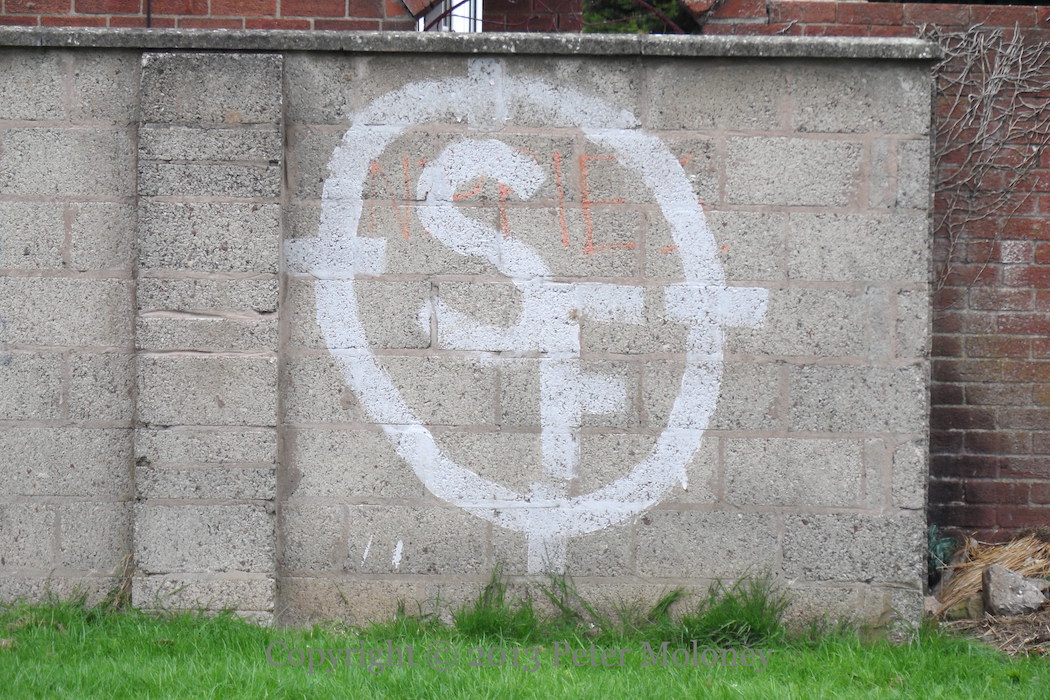 “Release Martin Corey, political prisoner. End internment now” with an unusual use of a dove rather than a lark. For background, see Release Martin Corey. With various other anti-Agreement graffiti and stencils in the area, including a “Join RSF [Republican Sınn Féın] – Éıre Nua” stencil, “SF” in a cross-hairs, and a “CIRA” “RIRA” cross-word.