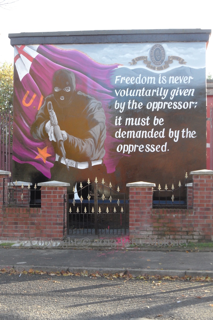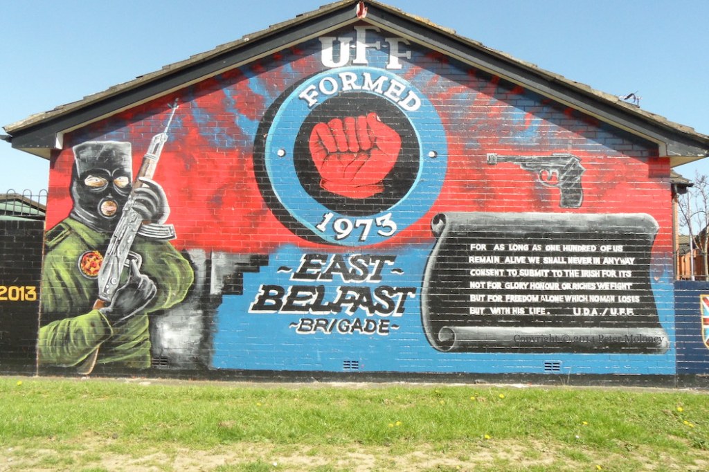 The UFF mural on the first gable of (so-called) Freedom Corner in east Belfast has been repainted many times since the first one took over – in 1991 – from a Gertrude Star mural (D00388). Repaints followed in roughly 2001, 2008, and 2011, now followed by the image shown above. The elements remain as before: a balaclava’d volunteer with assault rifle, the UFF emblem, a pistol, and a modified version of the Declaration of Arbroath: “For as long as one hundred of us remain alive we shall never in anyway consent to submit to the Irish [instead of “English”] for it’s not for glory, honour or riches we fight but for freedom alone which no man loses but with his life – U.D.A./U.F.F”
