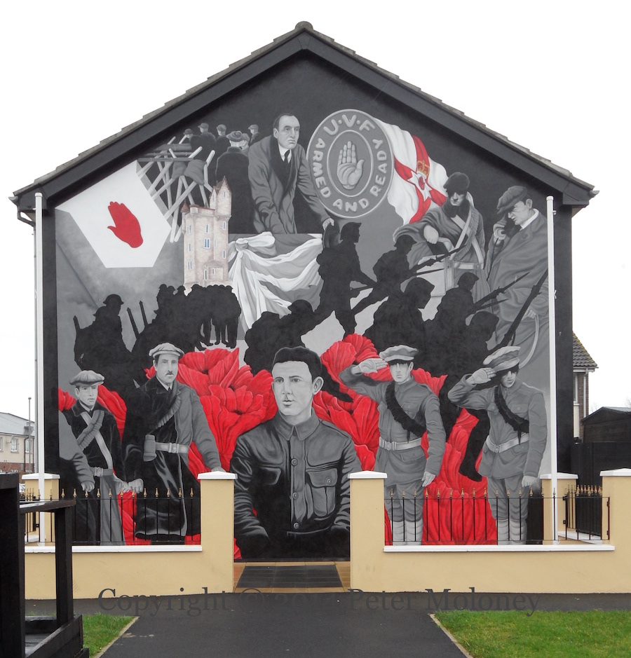 The newest one shows Carson signing the 1912 Covenant beneath a UVF emblem reading “Armed and ready”.