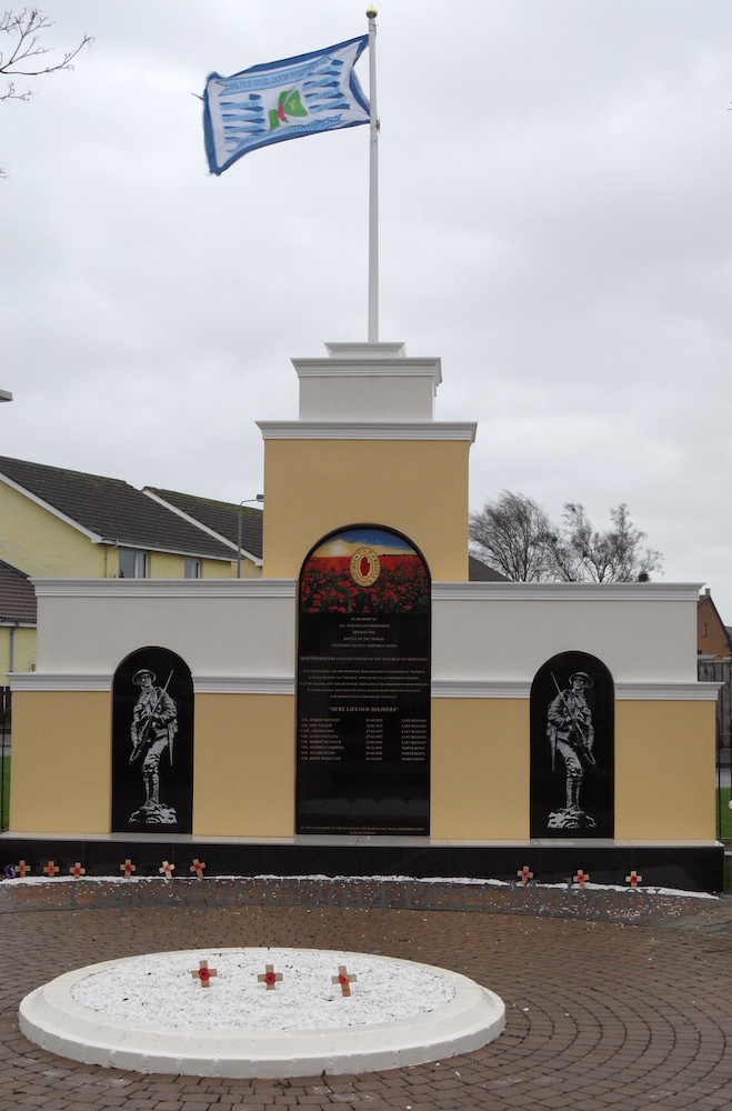 “This memorial is dedicated to the memory of the fallen Officers, NCOs and Volunteers of Number 4 Platoon, A Company, 1st Belfast Battalion, Ulster Volunteer Force. It serves as a tribute to those who fell while actively engaging the enemy from service having fulfilled their duties to the end. Their names and deeds are eternally venerated by their comrades in arms who continue to serve humbly in their honour. ‘They went with songs to battle, they were young,/Straight of limb, true of eyes, steady and aglow,/They remained staunch to the end against odds uncounted,/They fell with their faces to the foe.’ [Binyon’s ‘For The Fallen’]”