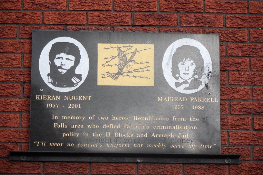 “Kieran Nugent 1857-2001, Maıréad Farrell 1957-1988. In memory of two heroic Republicans from the Falls area who defied Britain’s criminalisation policy in the H Blocks and Armagh Jail, ‘I’ll wear no convicts uniform nor meekly serve my time.'”
