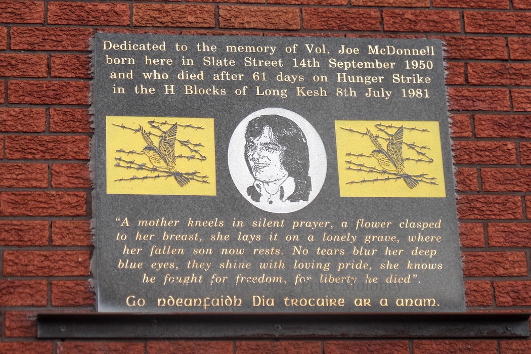 “Dedicated to the memory of Vol. Joe McDonnell born here in Slate Street 14th September 1950 and who died after 61 days on Hunger Strike in the H Blocks of Long Kesh 8th July 1981. ‘A mother kneels in silent prayer, a flower clasped to her breast, she lays it on the lonely grave, where her fallen son now rests. No tears blur her deep blue eyes, they shine with loving pride, she knows he fought for freedom, for liberty he died.’ Go ndéanfaıdh Dia trócaıre ar a anam.”