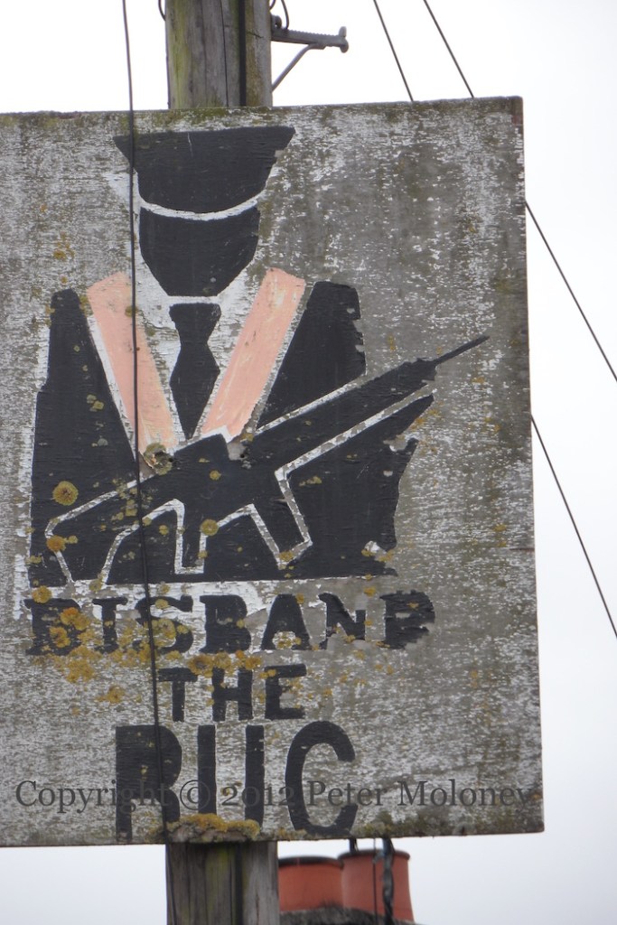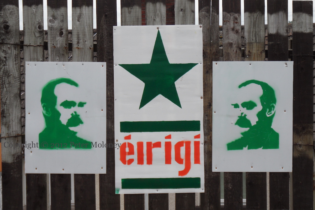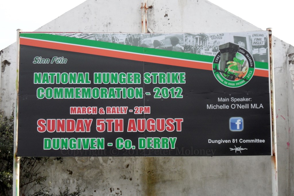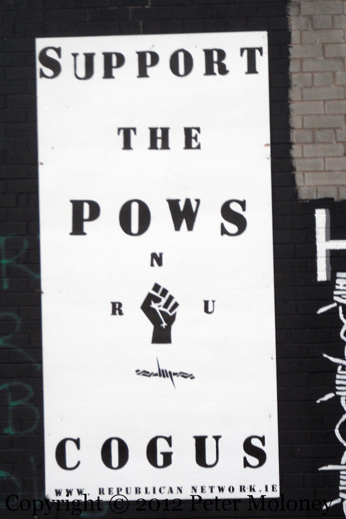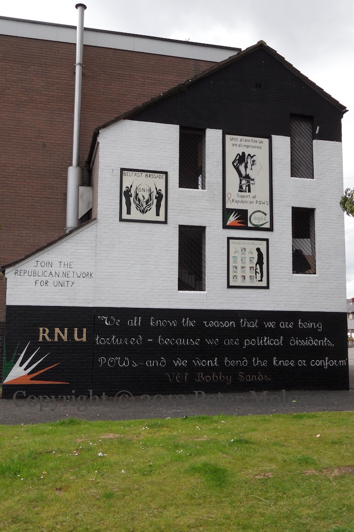 Here are three republican boards, framed: on the left, “Belfast Brigade ONH”; above right, “Until all are free we are all imprisoned – support all republican POWs – RNU (Fb)/Cogús (Fb); below right, the deceased 1981 hunger strikers. The lettering on the left reads “Join the Republican Network For Unity”, and below everything there is a Bobby Sands quote: “We all know the reason that we are being tortured – because we are political dissidents, POWs, and we won’t bend the knee or conform” (from Thoughts From The Shadows).