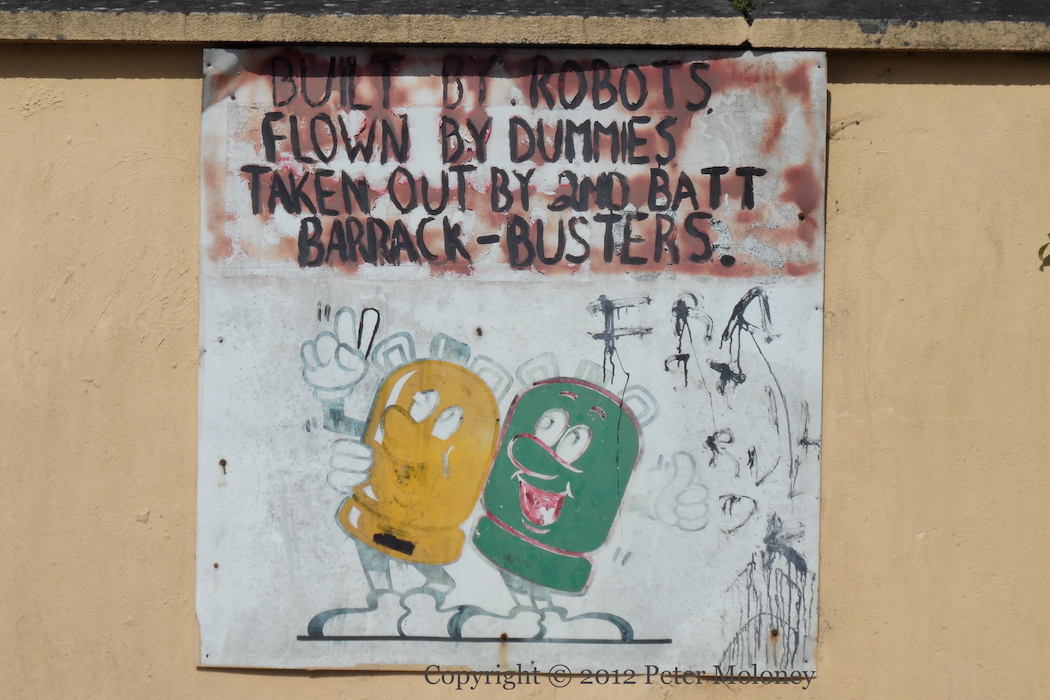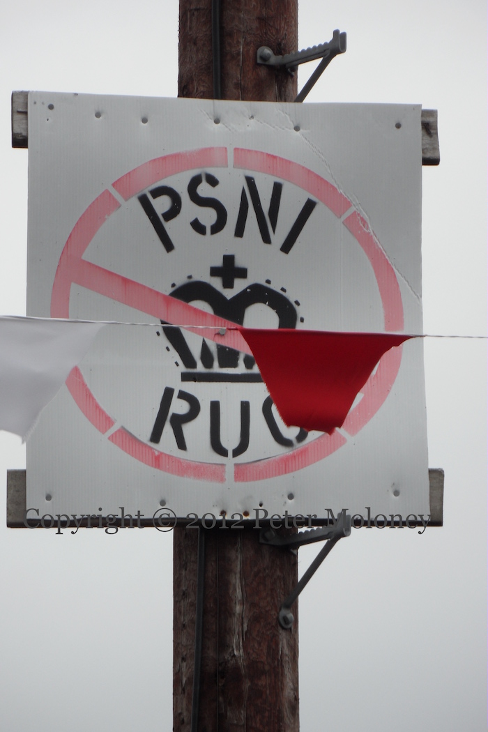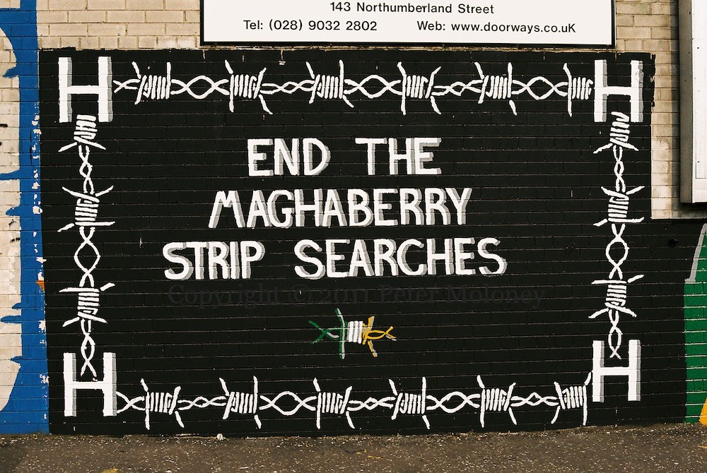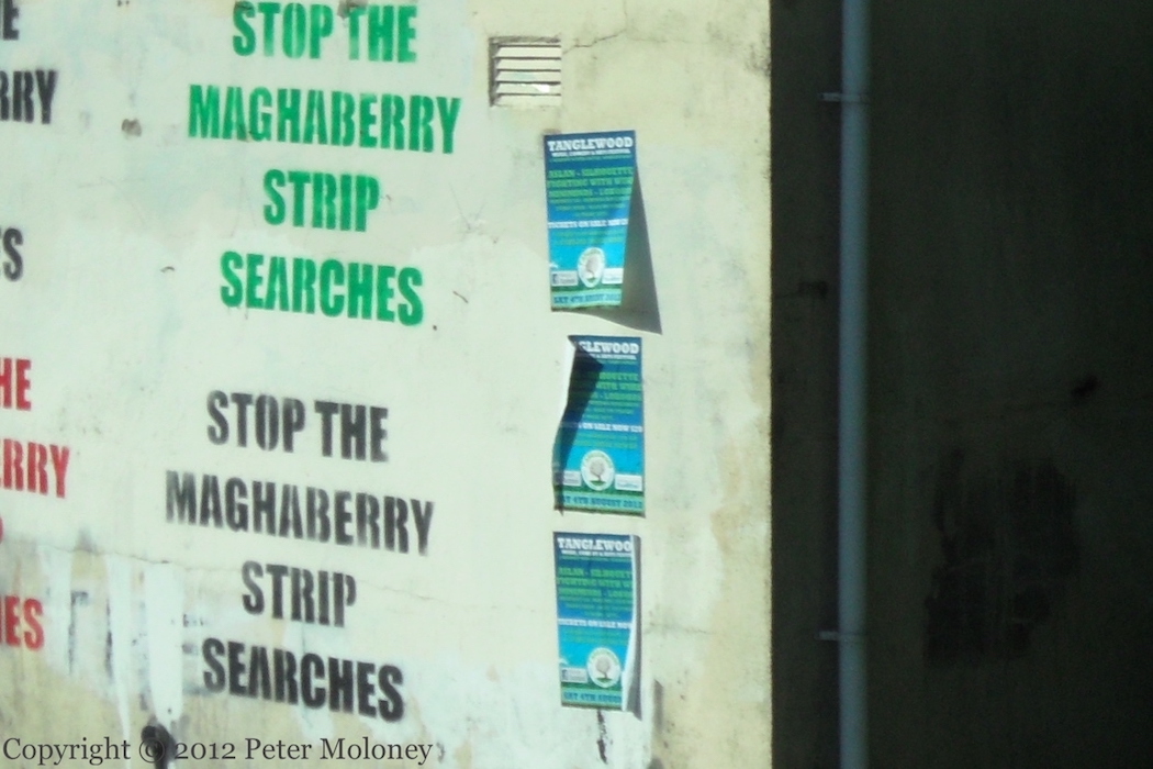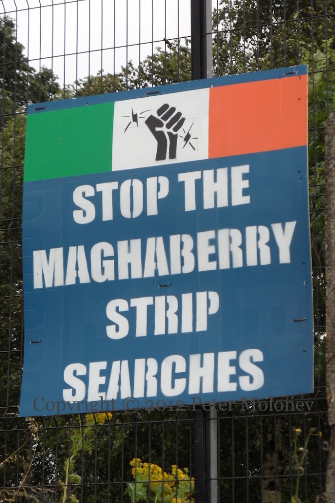 Here are three republican boards, framed: on the left, “Belfast Brigade ONH”; above right, “Until all are free we are all imprisoned – support all republican POWs – RNU (Fb)/Cogús (Fb); below right, the deceased 1981 hunger strikers. The lettering on the left reads “Join the Republican Network For Unity”, and below everything there is a Bobby Sands quote: “We all know the reason that we are being tortured – because we are political dissidents, POWs, and we won’t bend the knee or conform” (from Thoughts From The Shadows).
