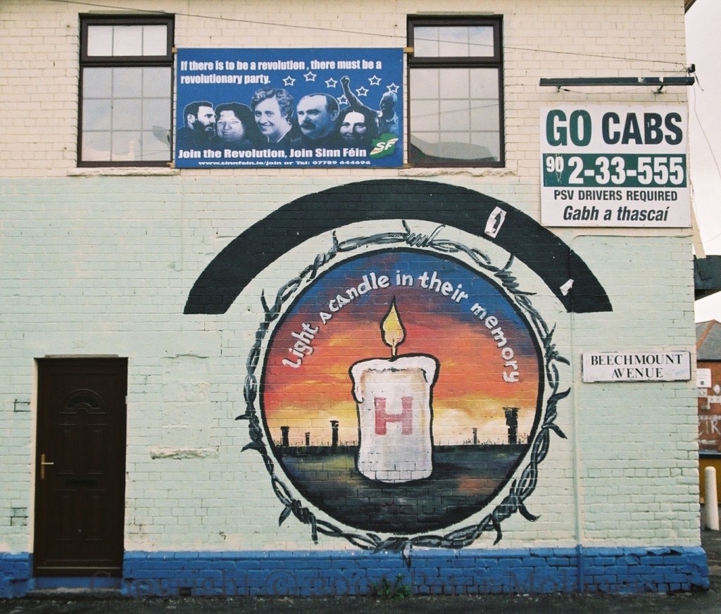 The frame of this mural in St James’s was originally painted in 1994 for a mural showing local pensioners remonstrating with a British Army soldier, under the title “The Spirit Of Freedom”. The central circle was repainted (again by Andrea Redmond) for the 1995 “green ribbon” campaign: the dove holds the keys that will set free the republican prisoners (symbolised by the barbed wire and a lark in the apex that cannot be seen).