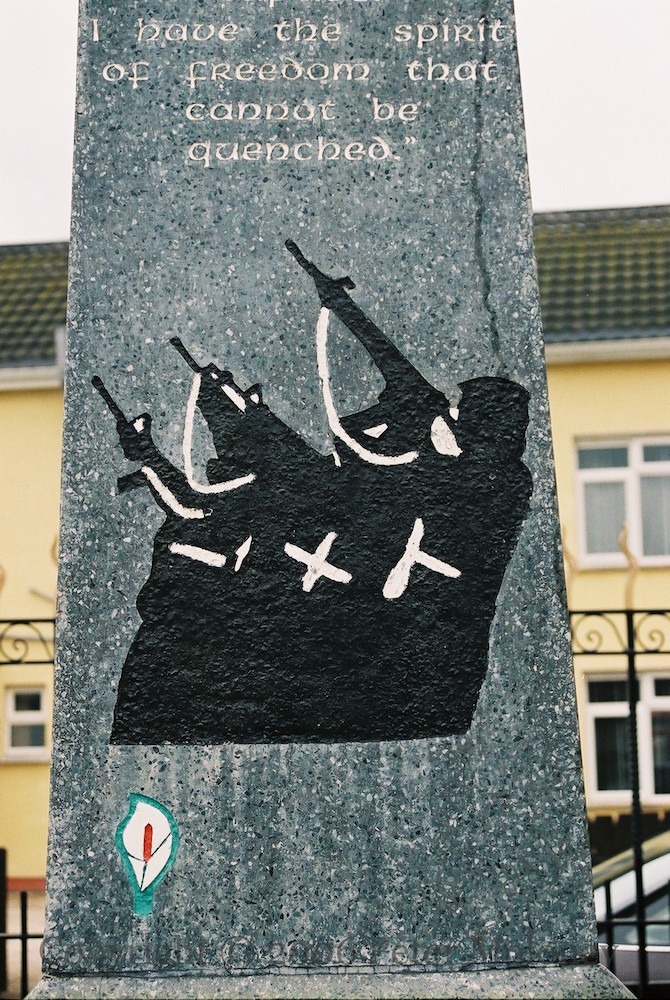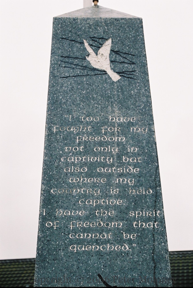 “This monument has been re-dedicated by the people of Twinbrook and Poleglass in honour of those volunteers of Óglaıgh Na hÉıreann who gave their lives for Irish freedom.” Gerard Fennell, John Rooney, Bobby Sands, Frankie Ryan. “Fuaır sıad bás ar son saoırse na hÉıreann”. “[Like the lark,] I too have fought for my freedom not only in captivity [where I now languish] but also [while on the] outside where my country is held captive … I have the spirit of freedom that cannot be quenched.” (Bobby Sands, The Lark And The Freedom Fighter, 1979)