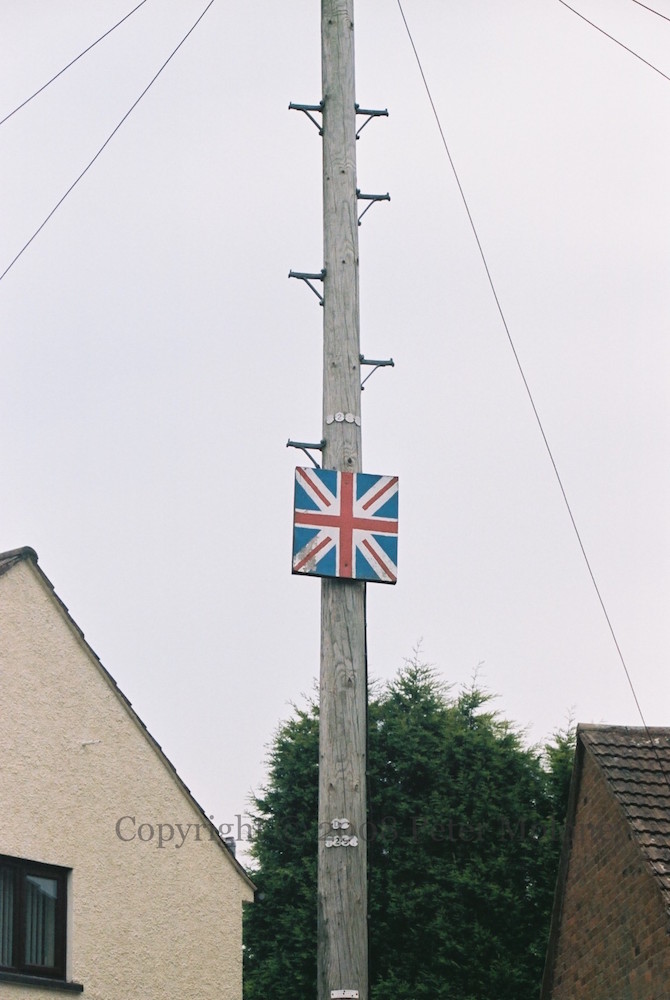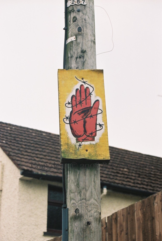 Small boards in the Killicomaine estate in Portadown, on Princess Way and Granville Road. The red hand in barbed wire symbolises loyalist prisoners. (There was another Union Flag board in Gilford Road.)