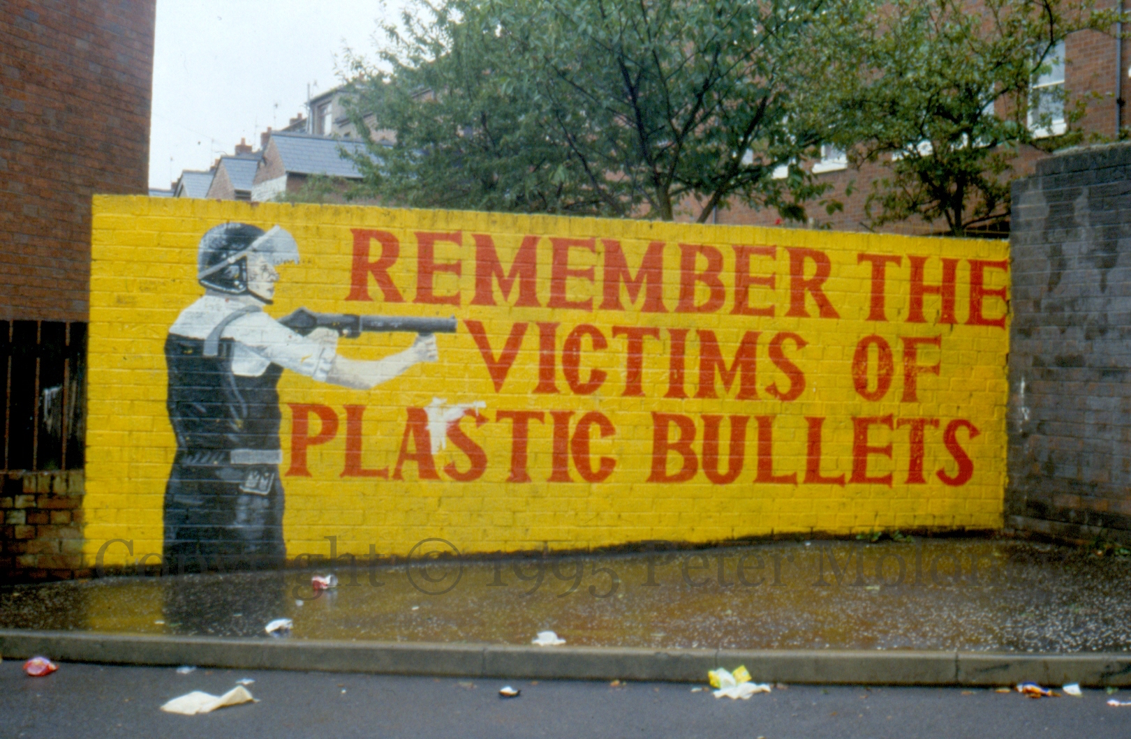 A week before Carol Ann Kelly was shot in Twinbrook, 14 year-old Julie Livingstone was also killed by a plastic bullet on May 13th, 1981 in Lenadoon. The stone shown above “was erected by young people of Leicester England”.