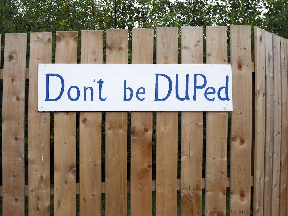 The stencil (“It is not racist to protect your own community”) and hand-painted board (“Don’t be DUPed”) indicate a recent change in attitudes.