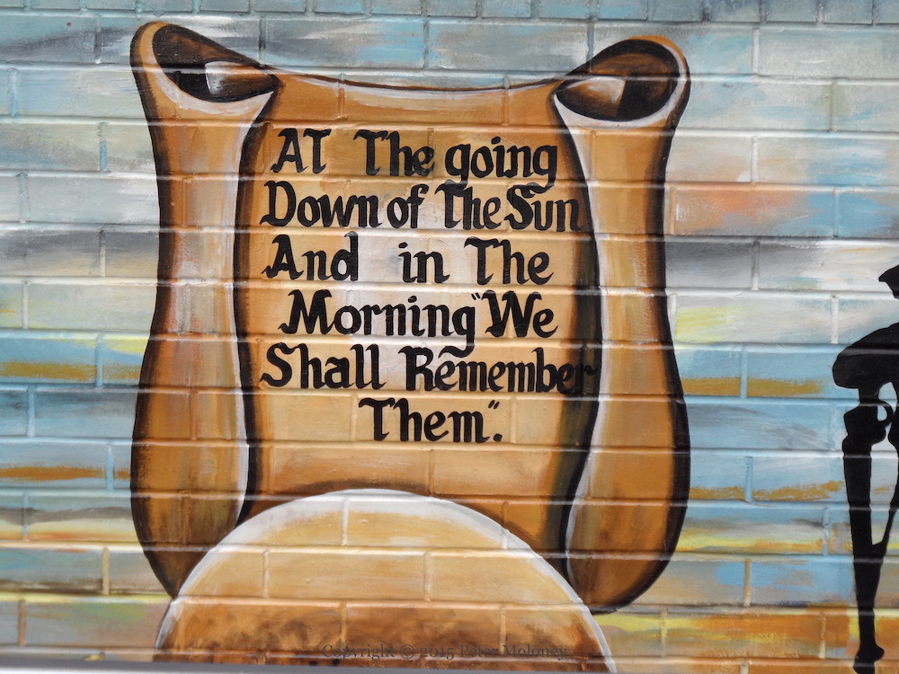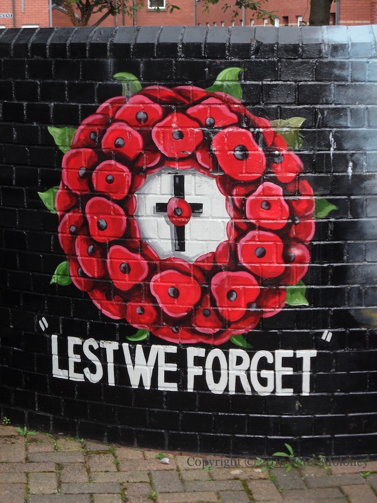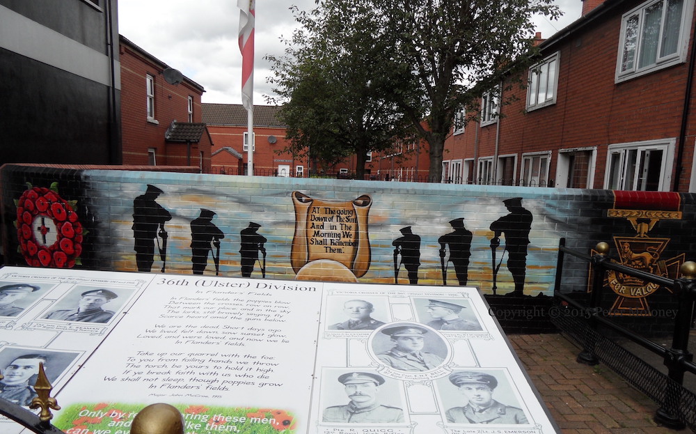 “At the going down of the sun and in the morning, we shall remember them.” The fence at the back of the Belvoir Somme Association’s Victoria Cross memorial garden on along the Newtownards (at the old Newcastle Street) has been replaced with a wall and the poppy wreath on the left (above) has been joined by a mural in memory of the Somme dead and the Victoria Crosses awarded to the 36th Division “For Valour”.