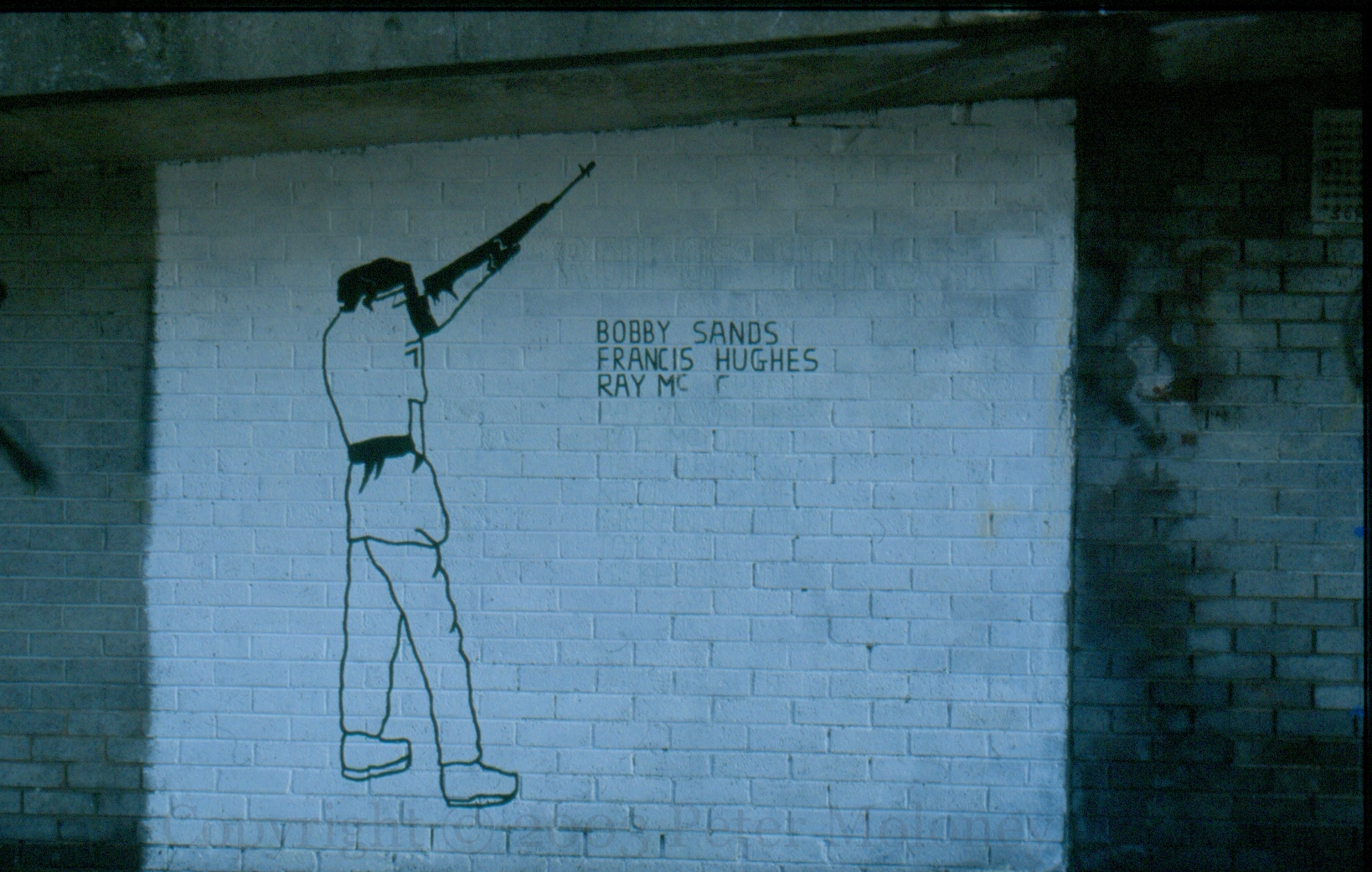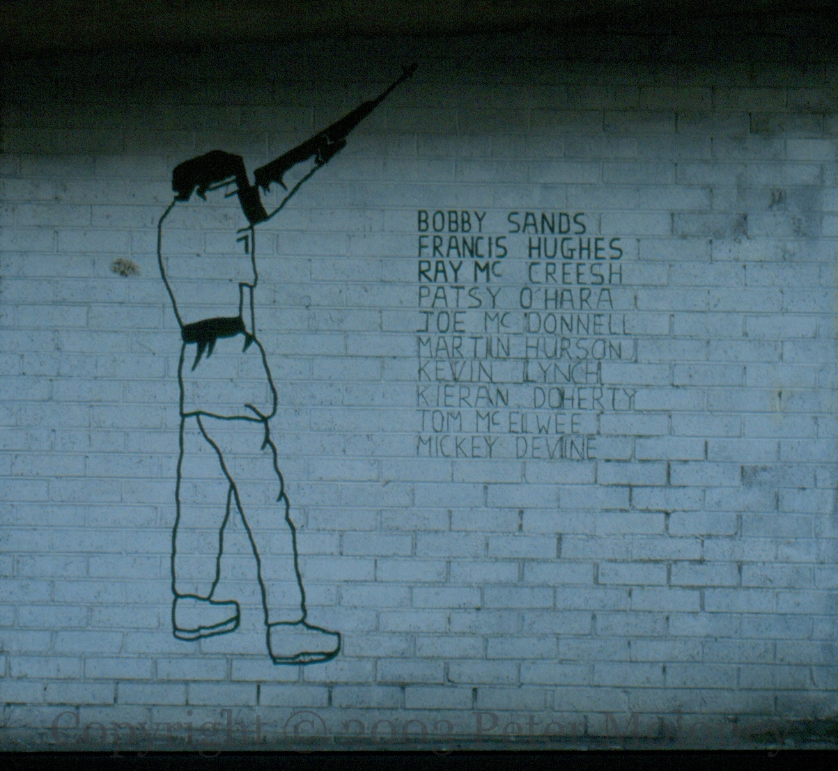 Three INLA volunteers are commemorated on this Rossville Street, Derry, plaque. 18 year-old Colm McNutt was shot by an undercover SAS officer during a botched hijacking, tipped off by best friend and informer Raymond Gilmour (Irish News). A drunken Phelan was shot by an off-duty NYPD officer in New York, nine years after leaving the country (LA Times | NY Times). McShane was run over and crushed by a British APC during riots against the treatment of Catholics during the Drumcree standoff (RN). “Thıg leo an réabhlóıdeach a mharú, ach ní thıg leo an réabhlóıd a mharú choíche.” [They can kill the revolutionary but they can never kill the revolution.]