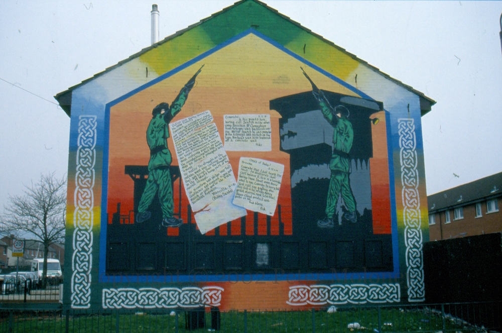 Here is the scene in Clowney Street, Belfast, in 2002: the (third? version of the) phoenix mural is 12 years old, and the funeral volley mural above it (seen in 2001) has lost one of its boards.