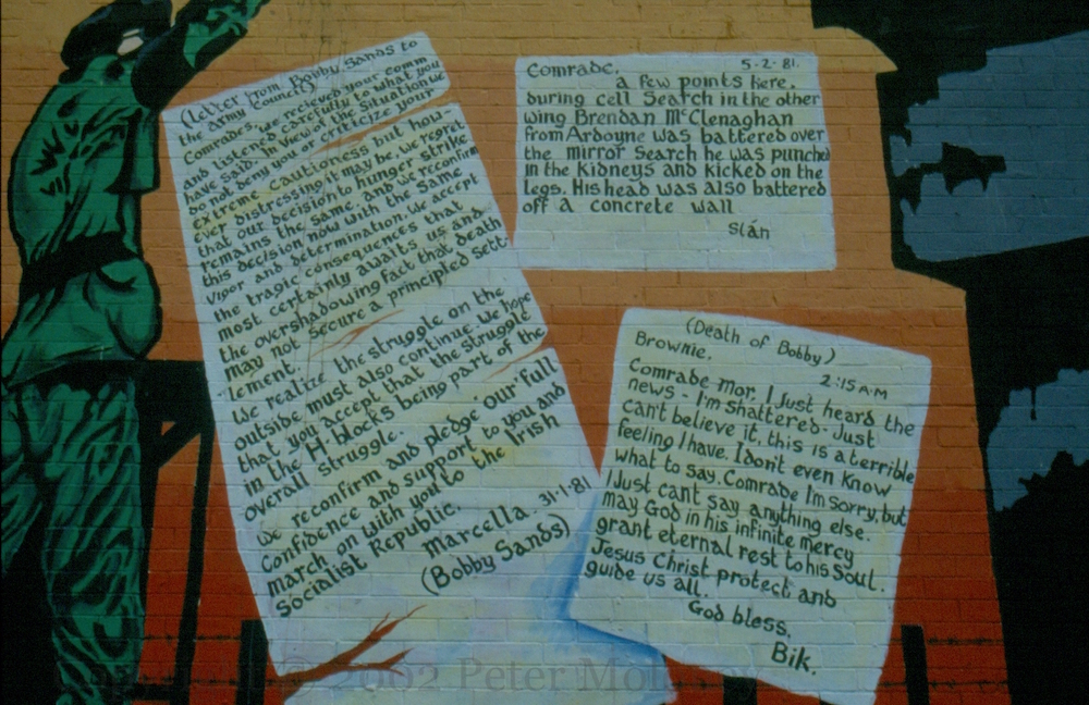 Two of the three comms (“communications”, messages by H-Block prisoners on tobacco paper or toilet paper and smuggled from wing to wing or to the outside) reproduced in this mural describe the decision to undertake the hunger strike (written by Bobby Sands) and the reaction to his death (from Ardoyne man Bik McFarlane to “Brownie” – Gerry Adams). The three describes a beating received by Ardoyne resident and blanket man Brendan McClenaghan.