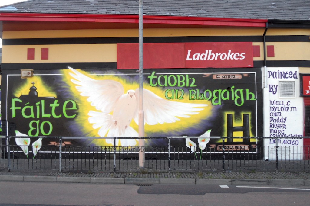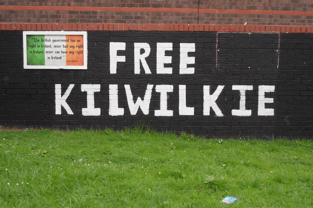 The small framed board to the left of “Free Kilwilkie” gives a line from James Connolly’s Last Statement prior to his execution in 1916: “The British government has no right in Ireland, never had any right in Ireland, never can have any right in Ireland”.