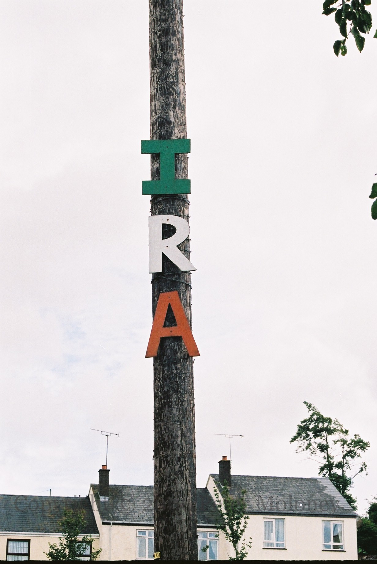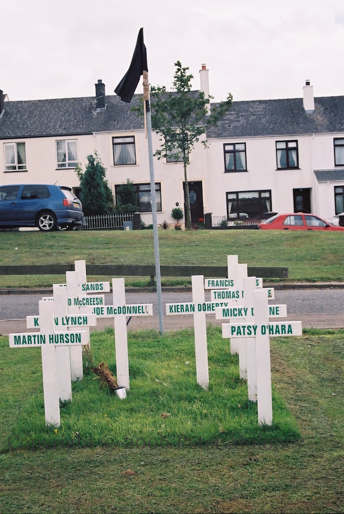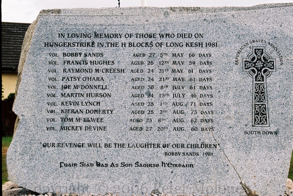 These three images are from the grassy areas at the junctions of Dublin Road and Tullyree Road in Kilcoo, Co Down. There is a large memorial stone from the South Down Republican Graves Association “in loving memory of those who died on hungerstrike in the H Blocks of Long Kesh” along with Sands’s quote, ten crosses in the shape of an “H”, and “IRA” letters nailed to the electricity pole. “Fuaır sıad bas [bás] ag [ar] son saoırse hEıreann [na hÉıreann] .”