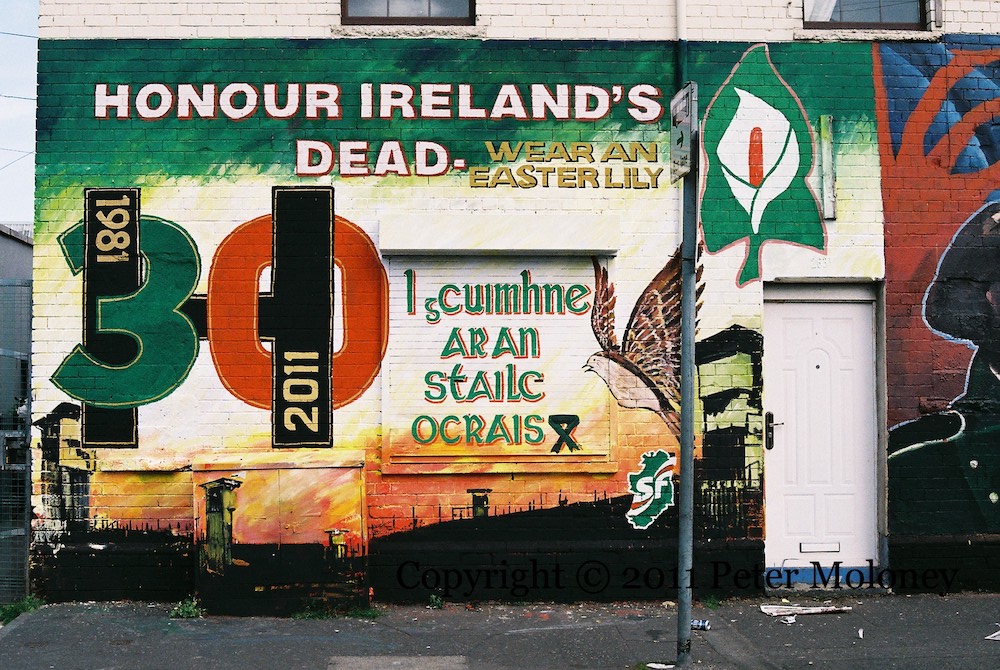 “Kieran Nugent 1857-2001, Maıréad Farrell 1957-1988. In memory of two heroic Republicans from the Falls area who defied Britain’s criminalisation policy in the H Blocks and Armagh Jail, ‘I’ll wear no convicts uniform nor meekly serve my time.'”