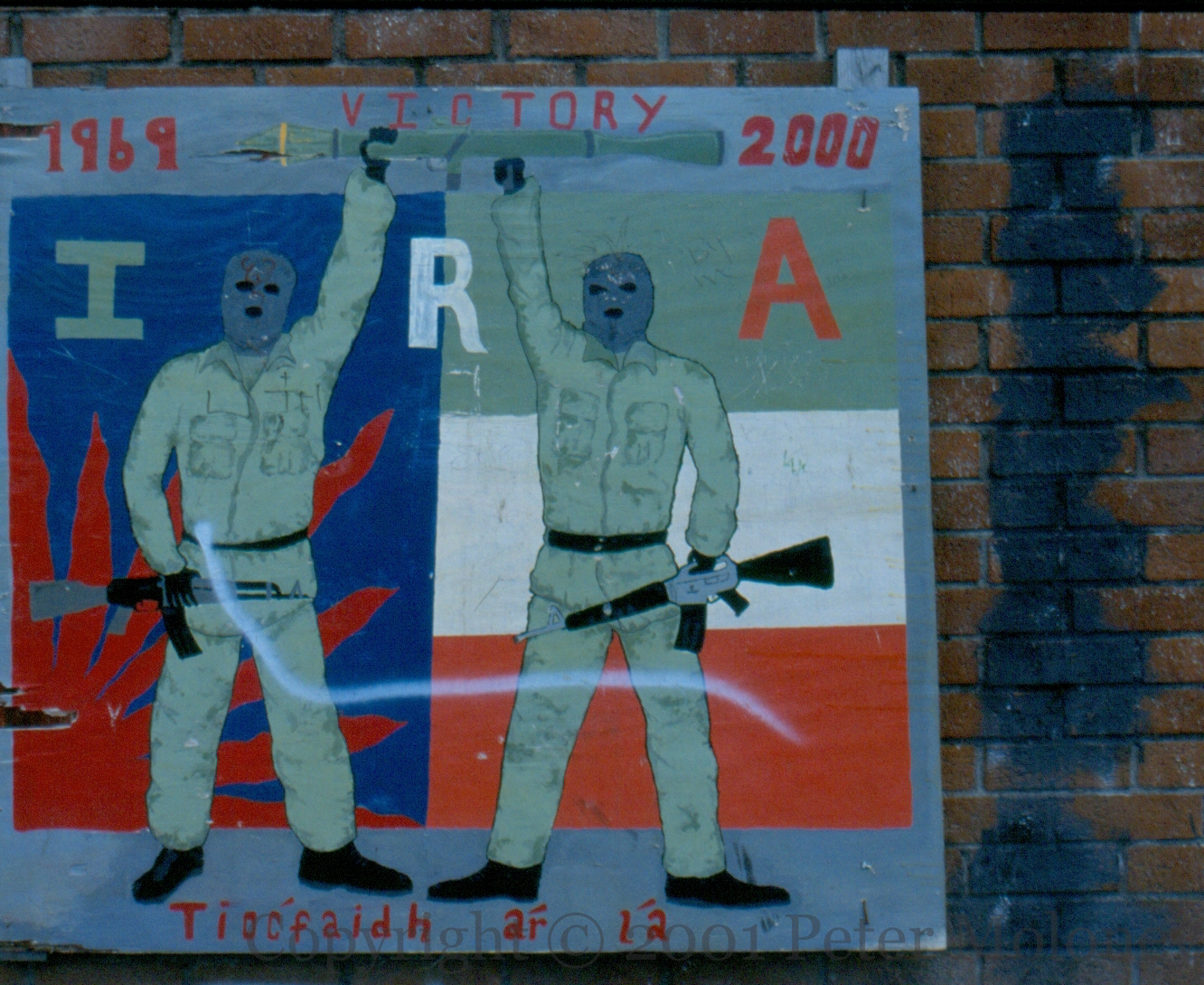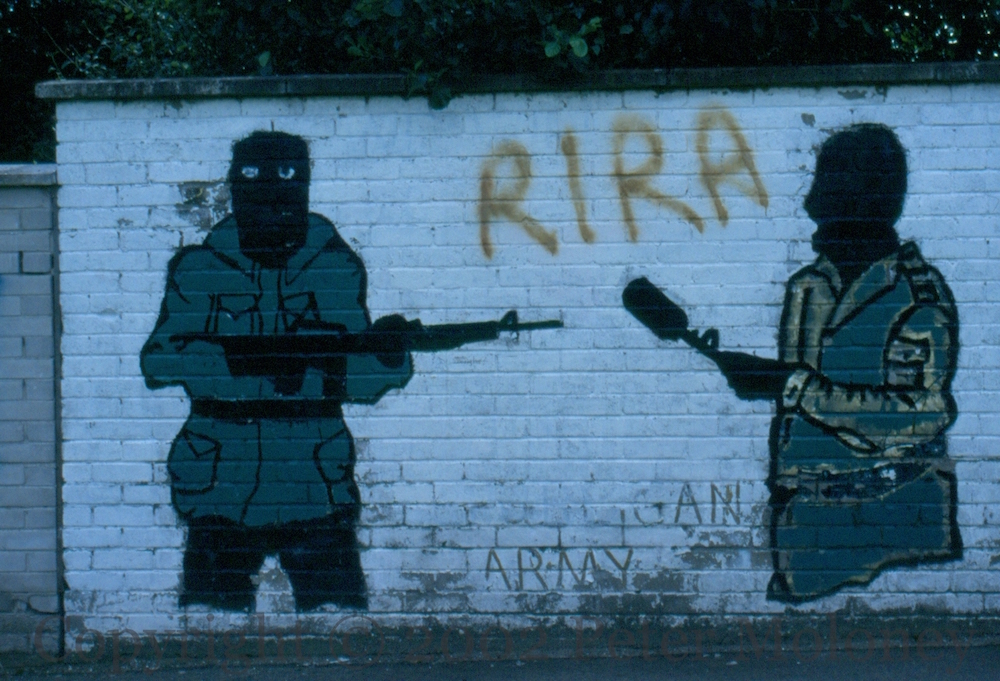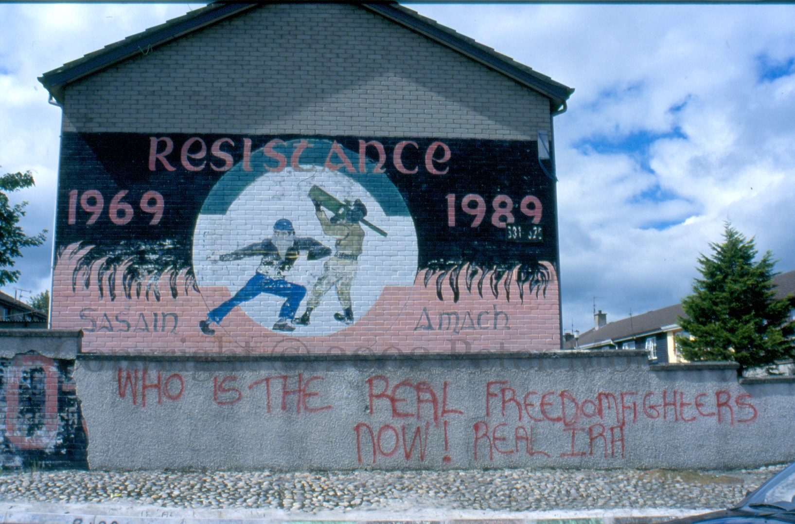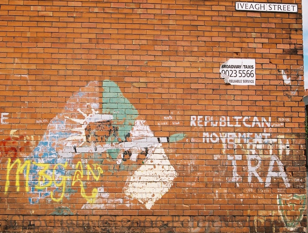Here is a gallery of images from Levin Road in Kilwilkie, Lurgan, including “One Ireland, one vote – 1916 Societies [web]”, “People Should Not Inform”, “RUC – PSNI not welcome”, “Join RSF [web] – Éıre Nua”, “IRA”, “IRPWA” [web], “End internment now”, “End the isolation of republican POWs”, “RUC – PSNI different name, same aim”, and “Ka-boom” from an RPG slamming into the side of the post office.