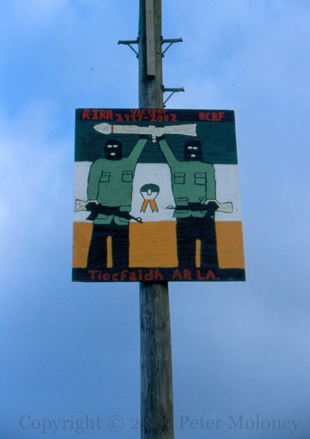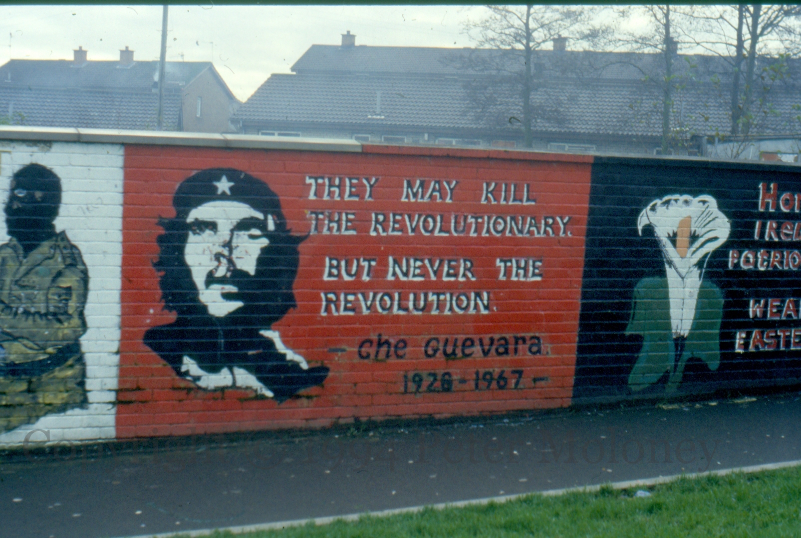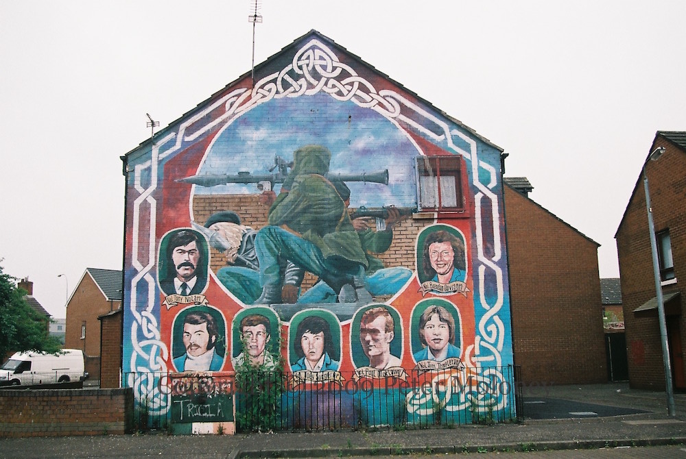 Here is a gallery of images from Levin Road in Kilwilkie, Lurgan, including “One Ireland, one vote – 1916 Societies [web]”, “People Should Not Inform”, “RUC – PSNI not welcome”, “Join RSF [web] – Éıre Nua”, “IRA”, “IRPWA” [web], “End internment now”, “End the isolation of republican POWs”, “RUC – PSNI different name, same aim”, and “Ka-boom” from an RPG slamming into the side of the post office.