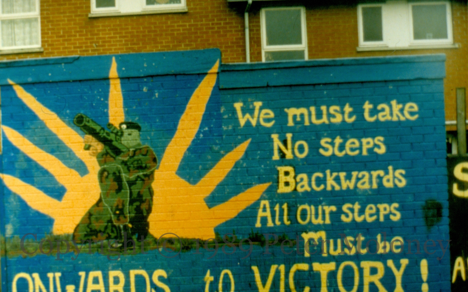 A volunteer with a suface-to-air missile (see SAM 7 Avenue, which is just out of shot to the right) with a quote from Sınn Féın and Cumann Na mBan leader Máıre Drumm: “We must take no steps backwards. All our steps must be onwards to victory!” Ballycolman, Strabane.