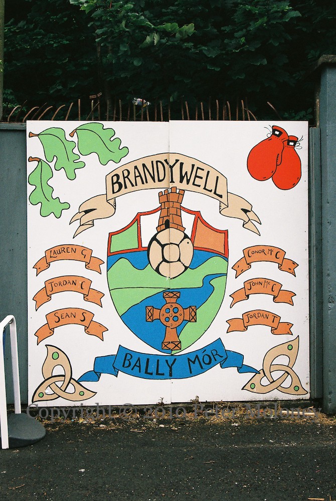 Derry City is the largest and most famous soccer club in Derry, but this mural mentions four other minor teams: senior league (first division) team Ballymoor, Northwest premier division team Brandywell Celtic, senior league (premier division) teams Brandywell Harps and Bluebell Celtic.