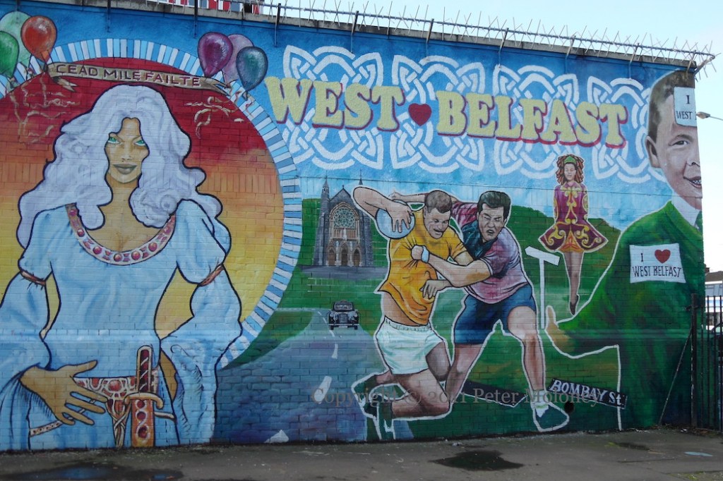 “Welcome to west Belfast”. West Belfast is portrayed as a place of music, sport, and dancing, whose landmark buildings and streets are under the watchful eye (and sword) of the goddess Érıu.