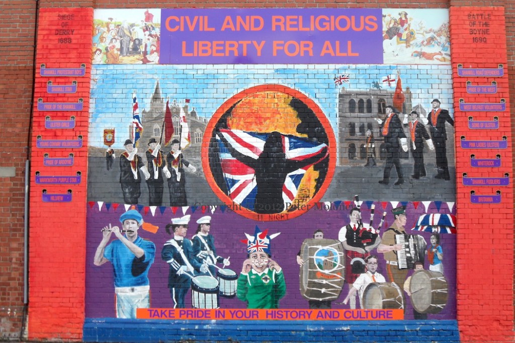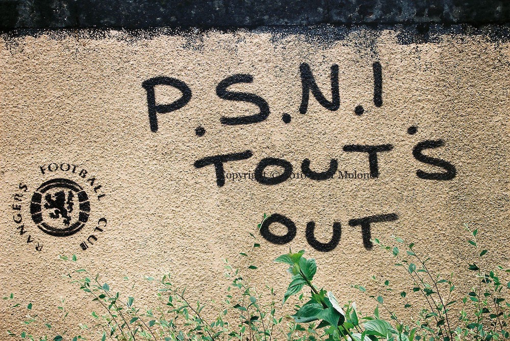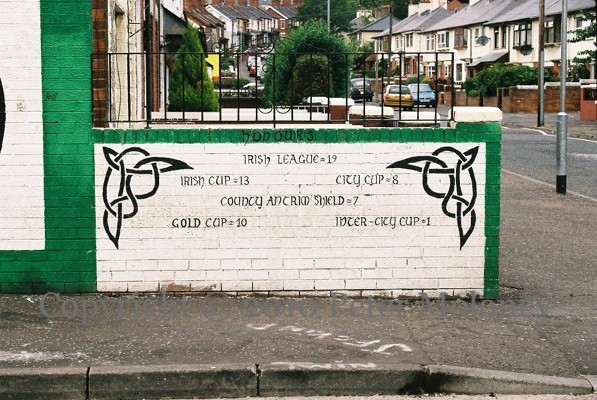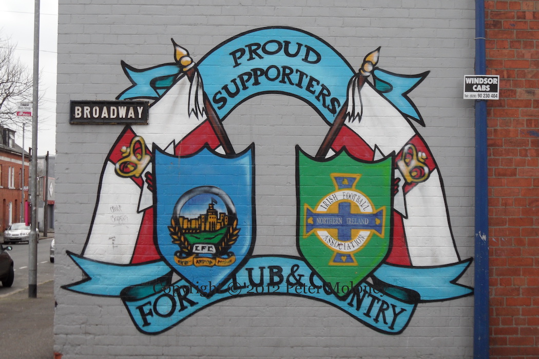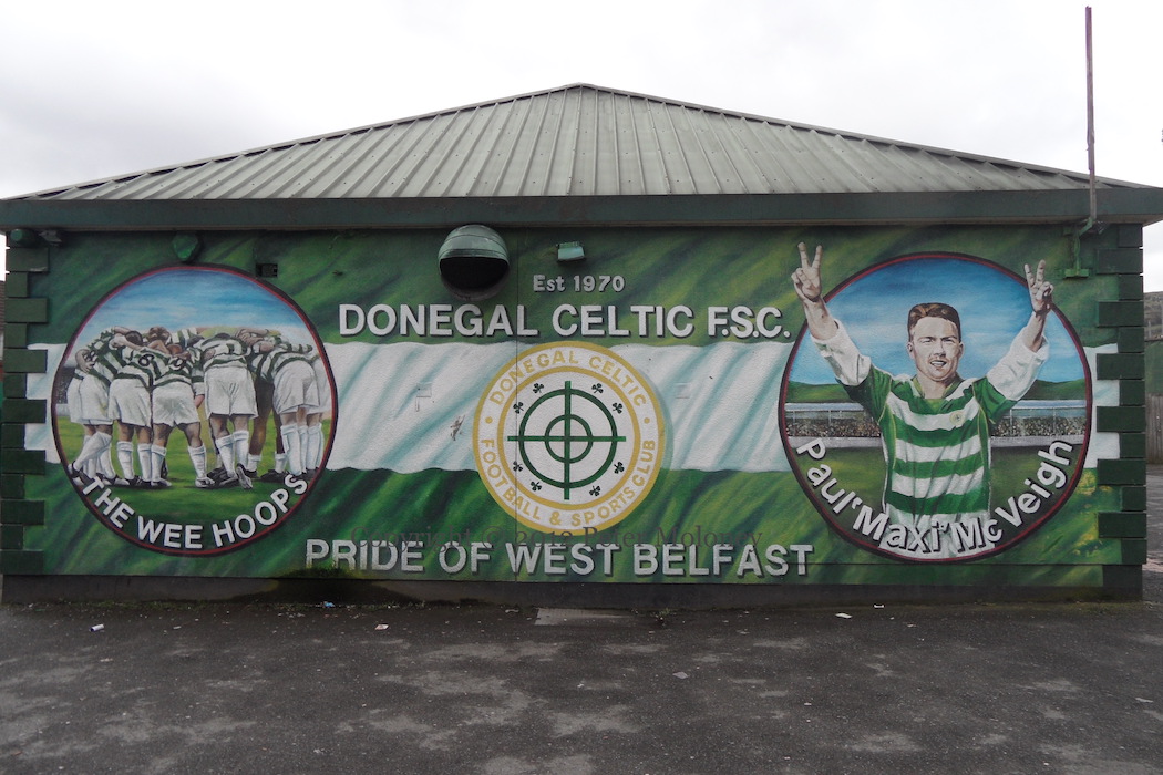 The stands of three football stadiums are shown in the background of the mural: Belfast Celtic’s Celtic Park (“Paradise”), Manchester United’s Old Trafford, and Barcelona’s Camp Nou. The Old Trafford stands bear the emblems of the teams Patrick O’Connell played for and managed: Liffey Wanderers (whose shirt is also featured, on the left), Sheffield Wednesday, Hull City (The Tigers), Manchester United, Dumbarton, Real Racing Club de Santander, Real Oviedo, and Real Betis Balompié (also shirt on the right).